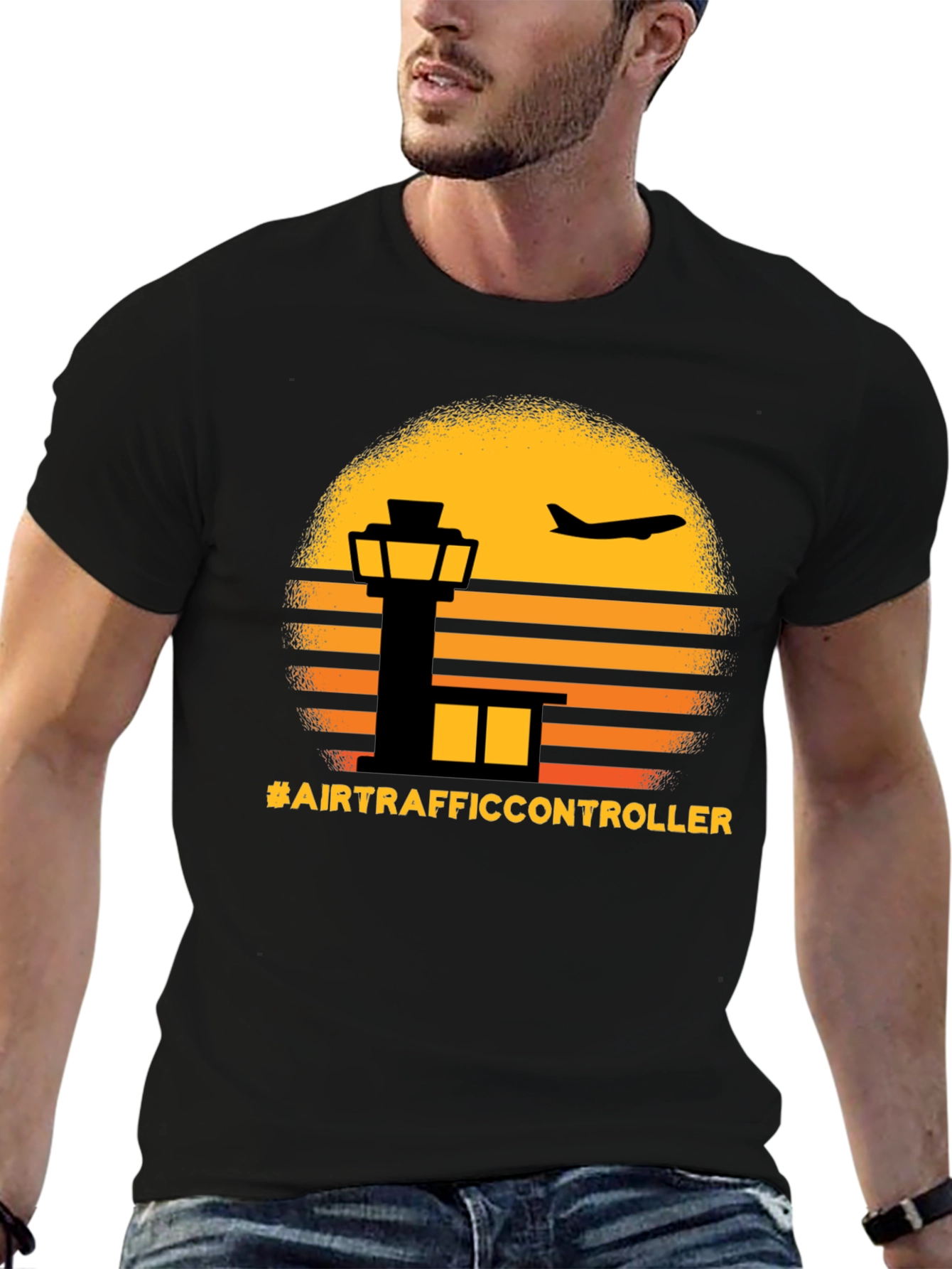 Elevate your style with this unique Air Traffic Controller graphic tee! Featuring a vintage-inspired sunset design with a silhouette of an air traffic control tower and an airplane, this shirt is perfect for aviation enthusiasts or anyone in the field. The vibrant orange and yellow hues create a striking contrast against the black shirt, making the design pop. Made from a comfortable, breathable fabric, this tee is ideal for everyday wear. Show off your passion for aviation with this eye-catching and conversation-starting tee!