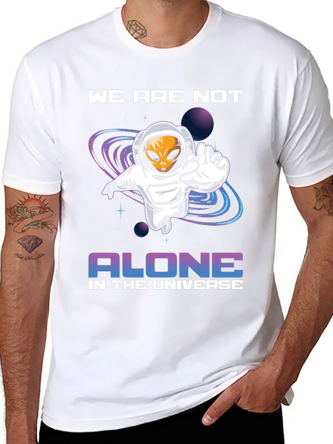 Embrace the cosmos with this striking black t-shirt featuring a unique alien in space design. Made from a soft, comfortable fabric, this tee showcases a vibrant graphic of an extraterrestrial figure in a space suit amidst swirling galaxies and celestial bodies. The bold text "WE ARE NOT ALONE IN THE UNIVERSE" adds a touch of mystery and intrigue. This eye-catching shirt is perfect for those who love astronomy, science fiction, or simply want to make a statement. Wear it casually with jeans or dress it up for a fun, unconventional look. Let your imagination soar beyond the stars with this out-of-this-world t-shirt.