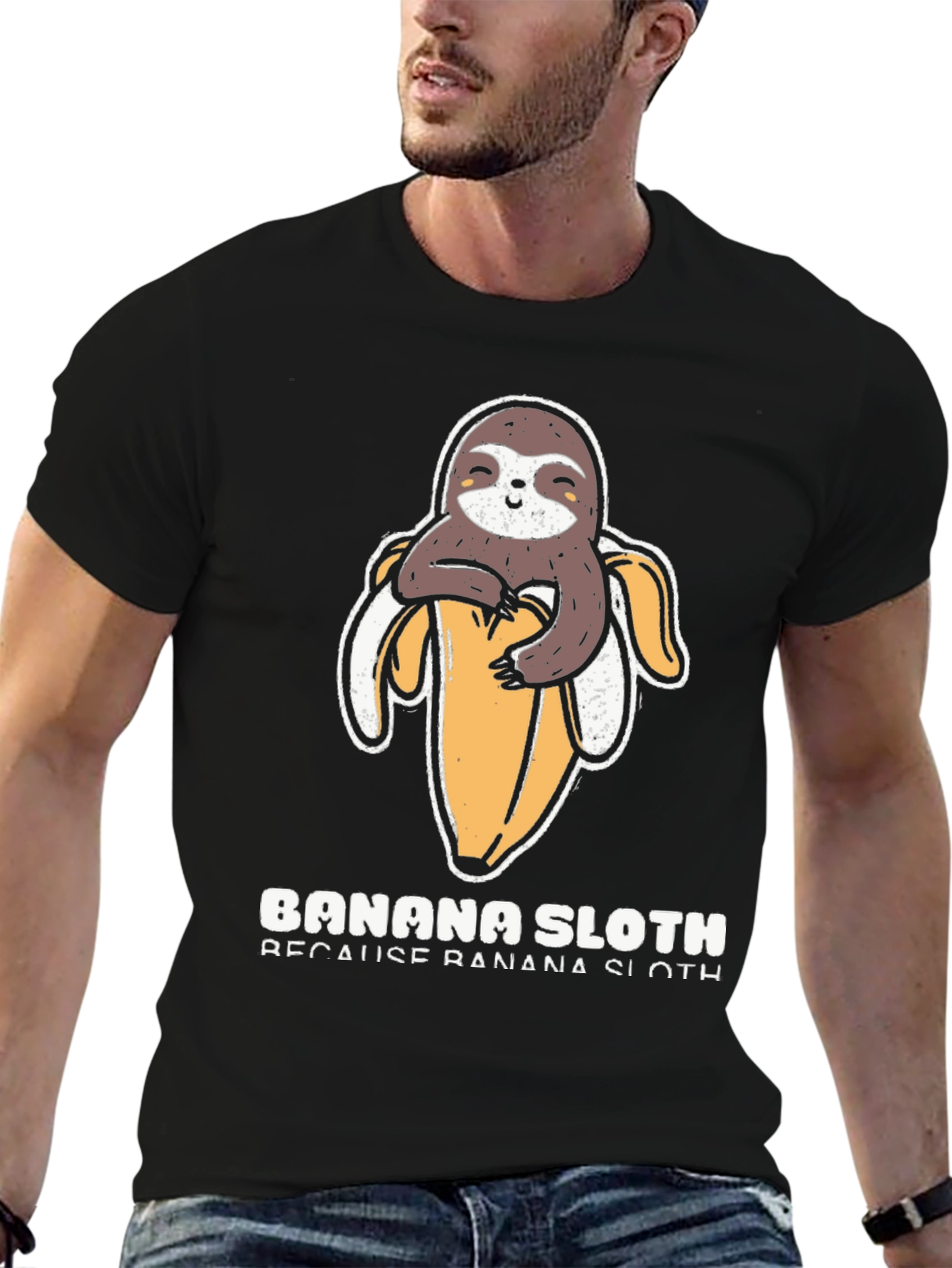 This black T-shirt features a fun and quirky graphic print. The design showcases an adorable sloth snuggled inside a peeled banana. The print is complemented by the text "Banana Sloth" and the phrase "Because Banana Sloth." Made from a soft, comfortable fabric, this tee is perfect for everyday wear. Its short sleeves and classic fit offer a relaxed feel, ideal for casual outings or lounging at home. The playful design makes it a great conversation starter and a fun addition to any wardrobe. A must-have for sloth and banana lovers!