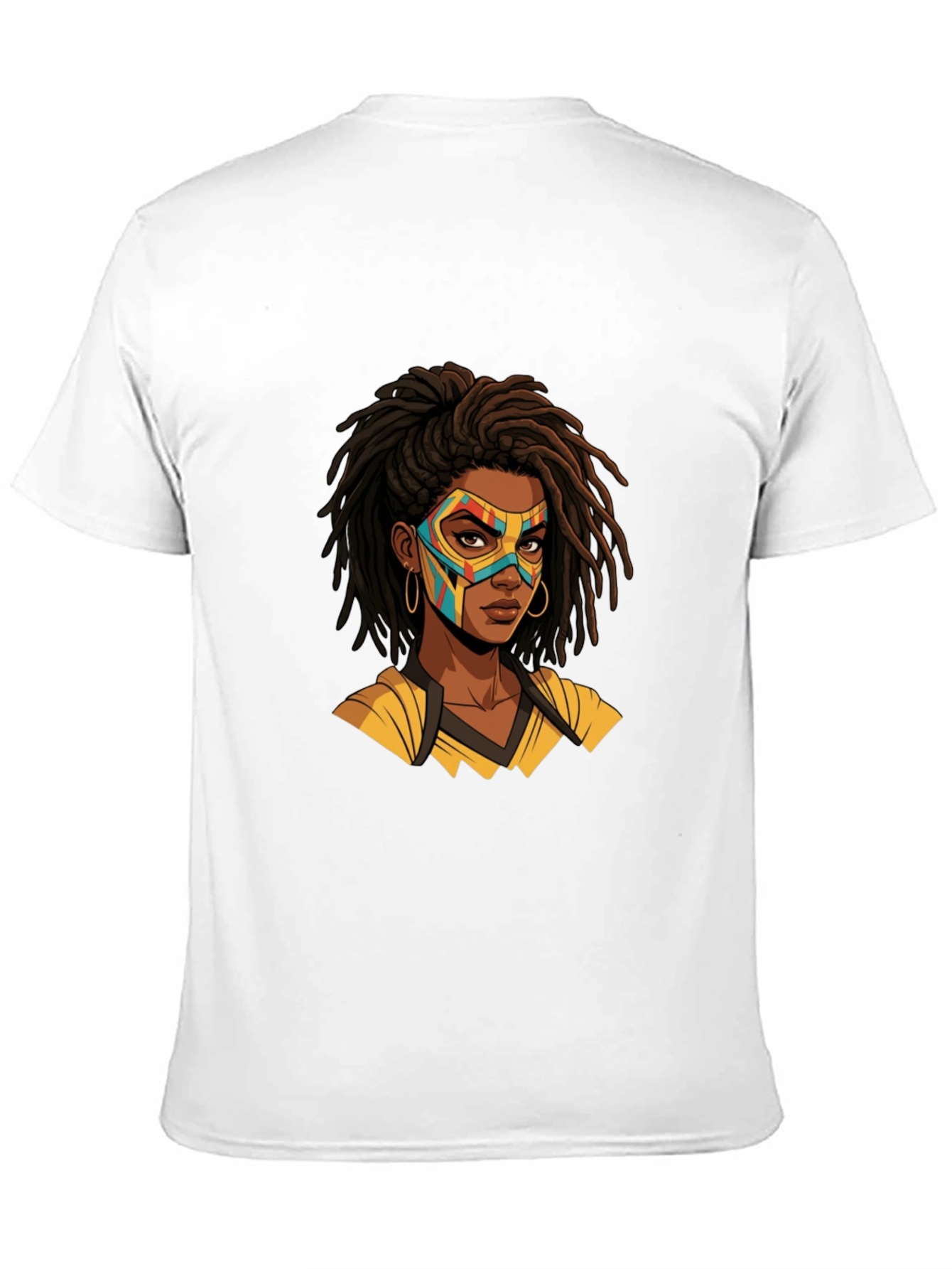 Show off your unique style with this eye-catching black t-shirt. The focal point is a vibrant graphic of a woman with a striking superhero-style mask, adding a bold and artistic touch. The shirt is made from a soft, comfortable fabric, perfect for everyday wear. The design features a detailed illustration with rich colors and sharp lines, making it a standout piece in any wardrobe. Pair it with jeans for a casual look or dress it up with a jacket for a night out. Express your individuality and love for art with this distinctive tee.