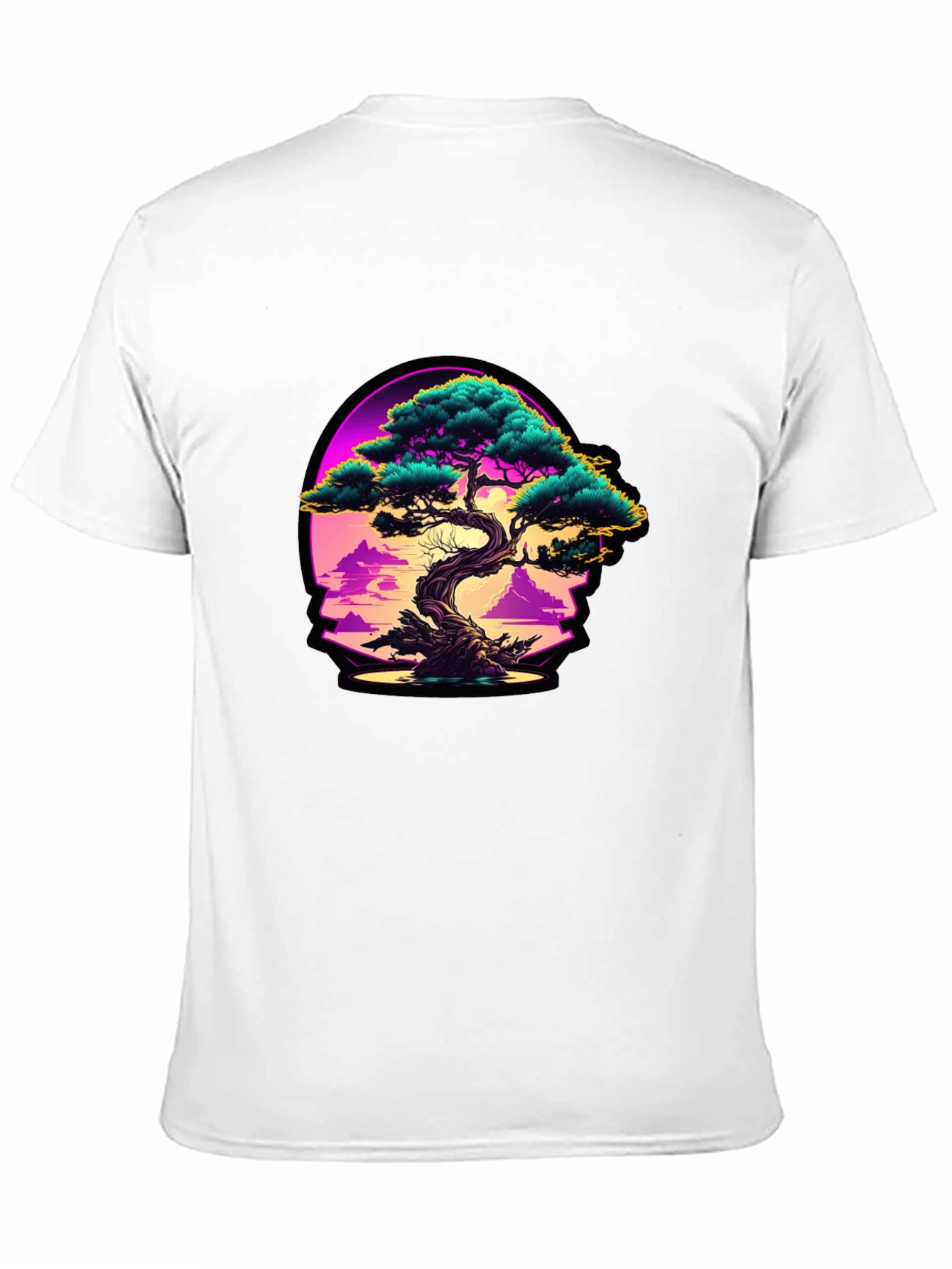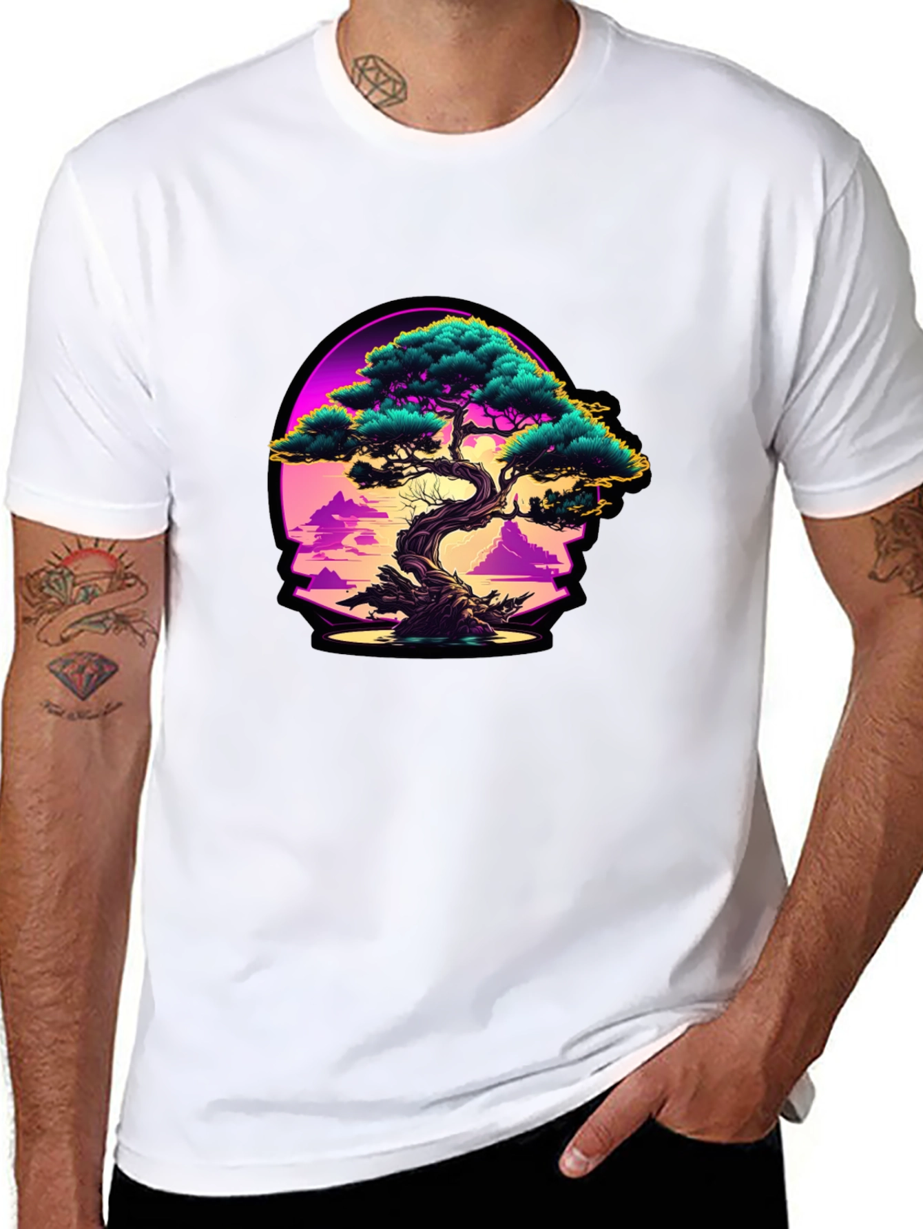 Elevate your style with this unique black graphic tee featuring a vibrant bonsai tree set against a stunning sunset backdrop. The intricate design showcases a detailed bonsai with lush green foliage, set within a retro-style circular frame that evokes a sense of calm and natural beauty. Made from comfortable, breathable fabric, this tee is perfect for everyday wear or a casual night out. Its eye-catching design ensures you'll stand out from the crowd. Pair it with jeans or shorts for a relaxed yet fashionable look. A must-have for any wardrobe!