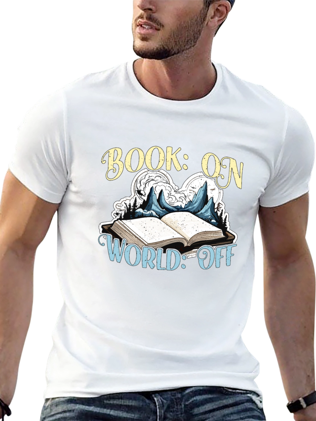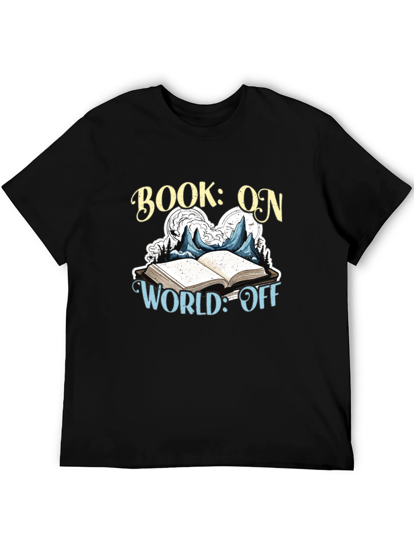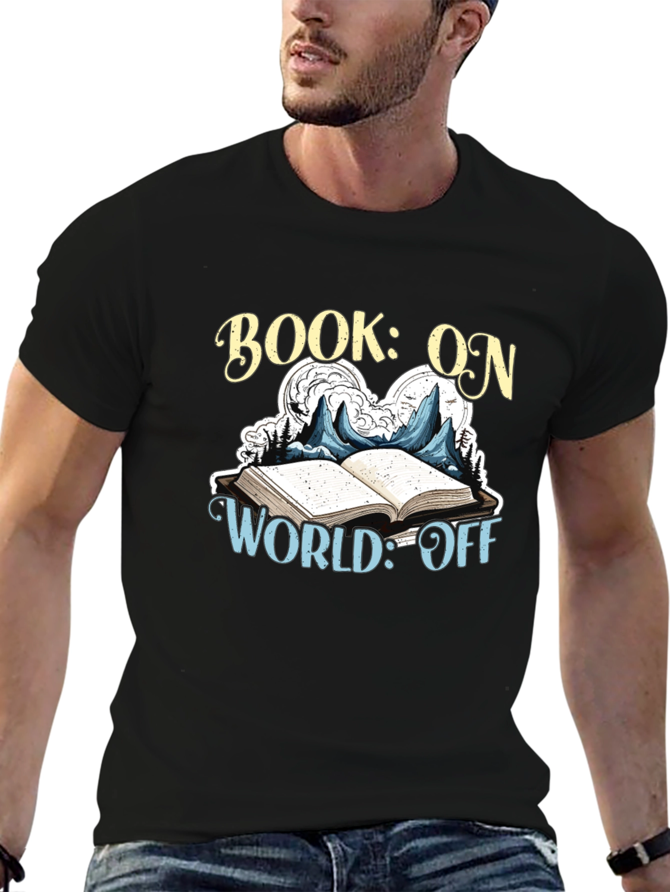 Escape into a good book with this stylish black graphic t-shirt. The design features an open book with mountains and trees emerging from its pages, topped with the phrase "BOOK: ON, WORLD: OFF." The light yellow and blue hues of the print contrast nicely against the dark background, creating a striking visual effect. Made from a soft-looking fabric, this t-shirt promises comfort and breathability. Perfect for book lovers and introverts, it's ideal for casual wear, library visits, or relaxing at home with a favorite novel. Show off your love for reading with this unique and eye-catching tee!