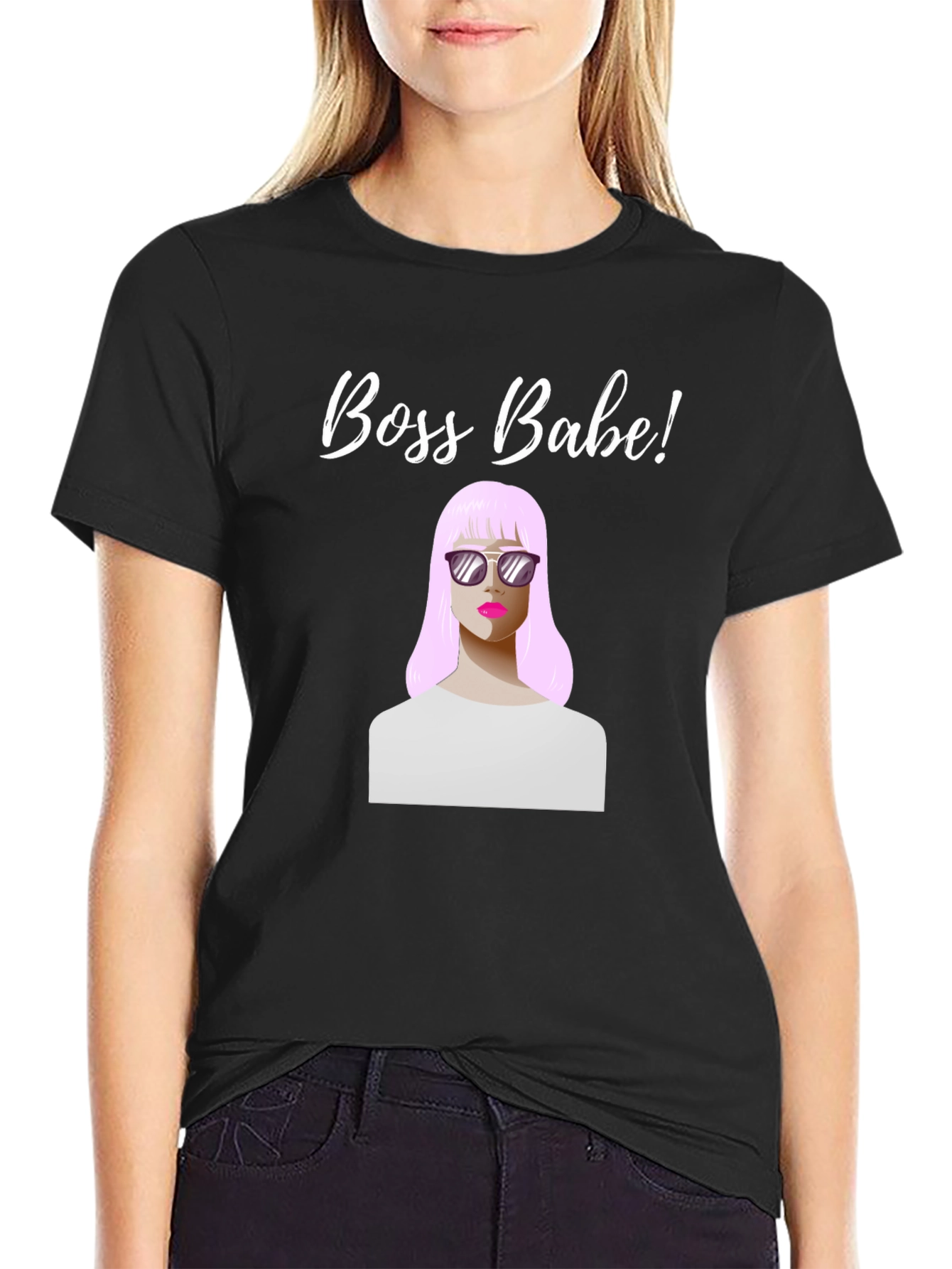 Show off your confident style with this eye-catching black graphic tee. Featuring a 'Boss Babe' design with a woman sporting pink hair and sunglasses, this t-shirt is perfect for making a statement. Made from a comfortable fabric, this shirt offers a relaxed fit suitable for everyday wear. The design is bold and playful, adding a touch of personality to any outfit. Wear it casually with jeans or dress it up with a blazer. A must-have for anyone who loves to express their unique style and attitude.