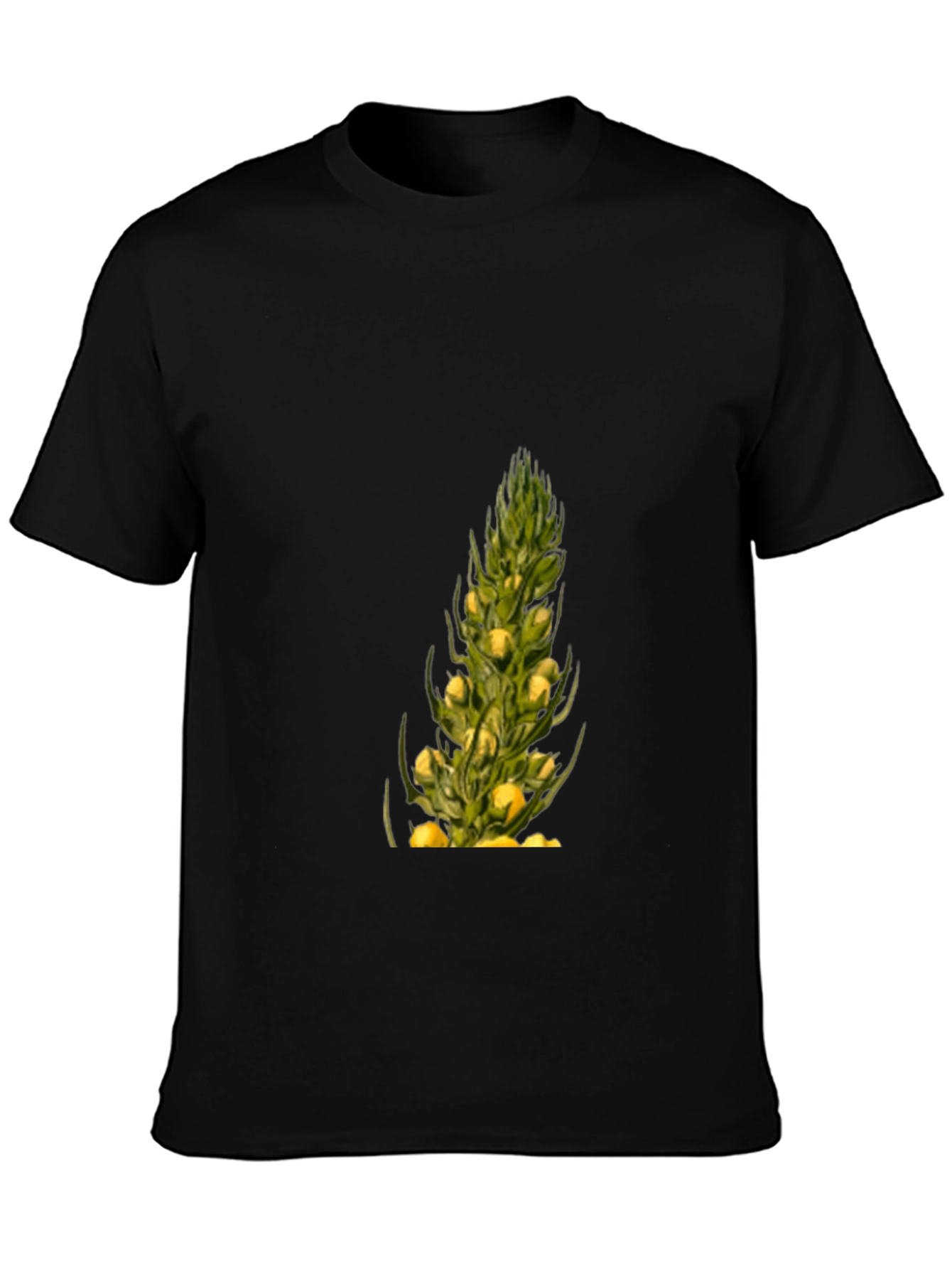 This classic black t-shirt features a unique botanical print design, showcasing a vibrant, vertically-oriented plant with green stalks and yellow buds. The print adds a touch of nature-inspired style to the versatile black backdrop. Made from what appears to be a soft, comfortable fabric, this tee is perfect for everyday wear. Its relaxed fit ensures a comfortable experience, while the eye-catching print makes it a stylish statement piece. Dress it up with a blazer or keep it casual with jeans – this t-shirt is a great addition to any wardrobe. The placement of the print is designed to catch the eye and add a pop of color to your look.