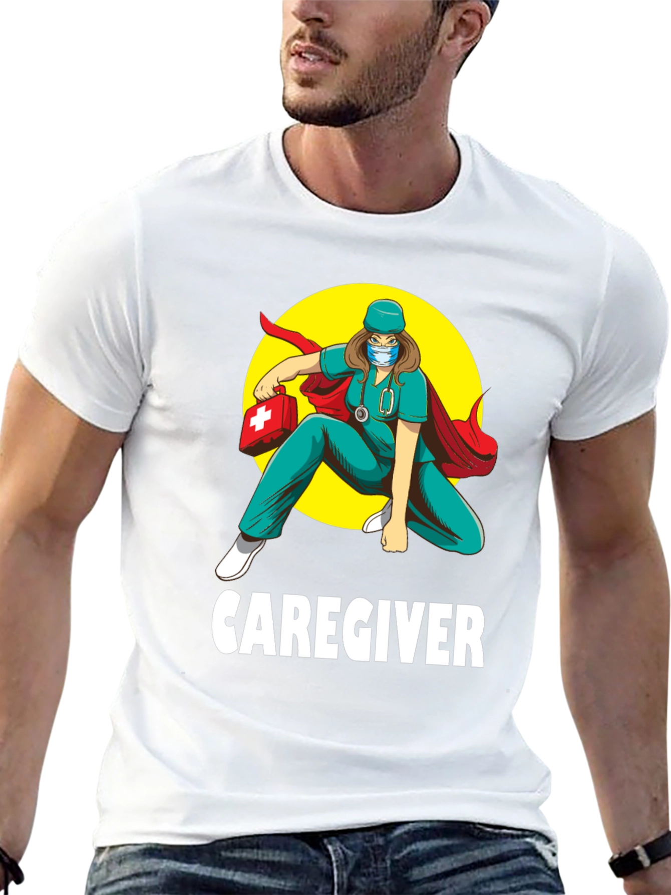 Show your appreciation for caregivers with this unique t-shirt! The design features a cartoon-style superhero caregiver, complete with a cape, mask, and first aid kit, set against a vibrant yellow background. The word "CAREGIVER" is boldly displayed across the chest. This black t-shirt is made from a comfortable material and is perfect for everyday wear. Ideal for showing support or as a gift for the caregiver in your life. Celebrate their dedication and make a statement with this eye-catching tee.
