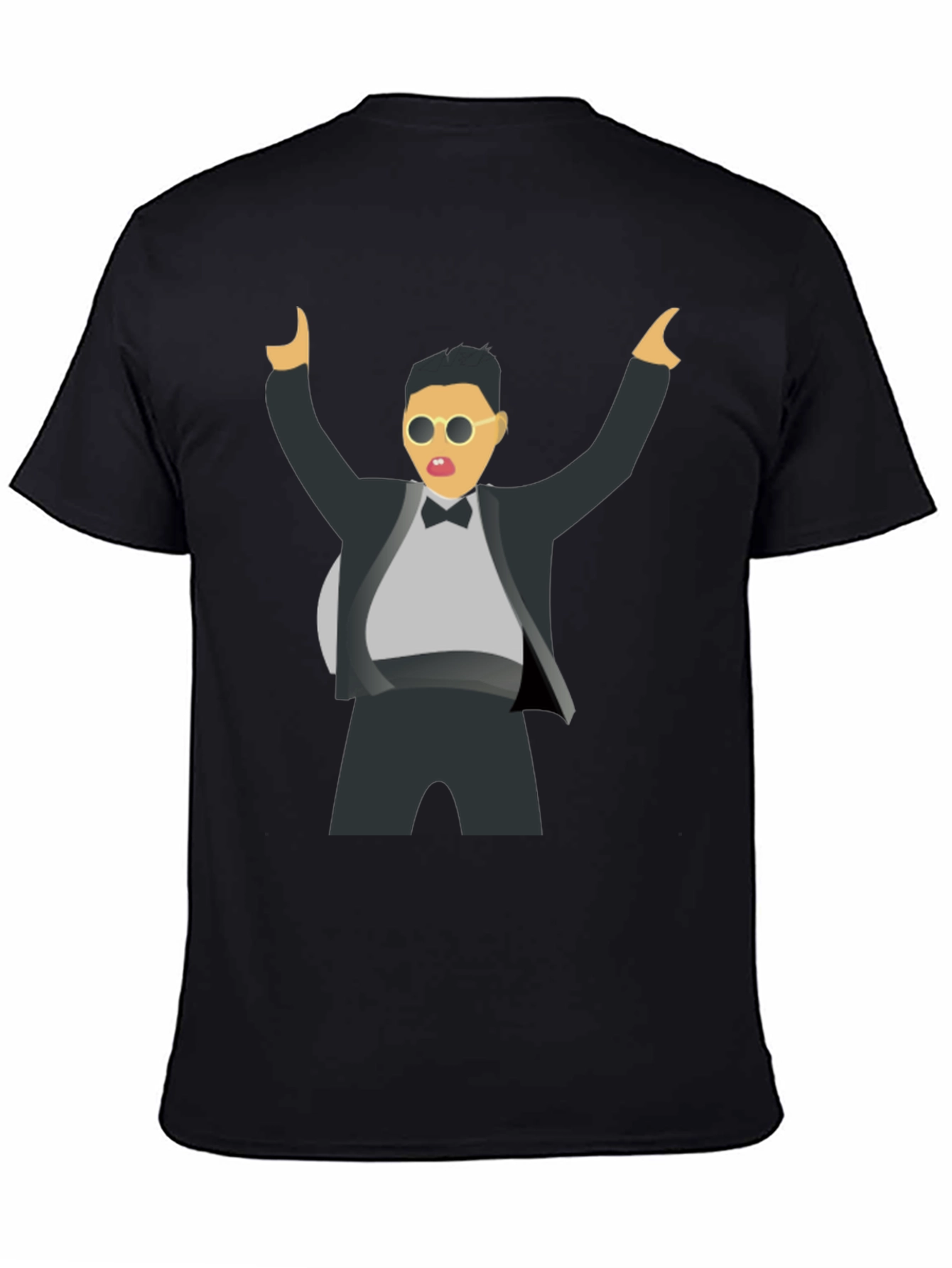 Show off your fun side with this stylish black t-shirt! Featuring a vibrant cartoon graphic of a figure in a tuxedo and round sunglasses, striking the iconic pose from Gangnam Style. The design is printed on a soft, comfortable fabric, making it perfect for everyday wear. Whether you're hanging out with friends, attending a casual event, or just want to make a statement, this tee is sure to turn heads and spark conversations. Express your personality and add a touch of humor to your wardrobe with this trendy graphic tee.