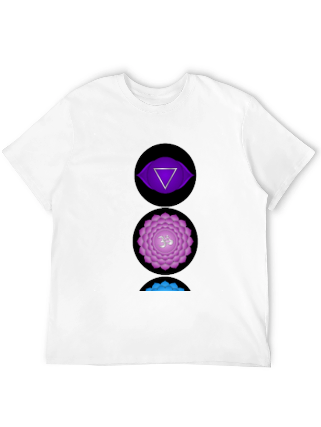 Elevate your style with this unique black t-shirt featuring vibrant chakra symbols. This eye-catching tee displays three prominent chakra designs in stacked circular frames in shades of purple, pink and blue. Crafted from a soft, comfortable fabric, this stylish and meaningful shirt offers a relaxed fit for everyday wear. Perfect for yoga enthusiasts, spiritual seekers, or anyone who appreciates mindful fashion. Make a statement and showcase your connection to energy and balance with this vibrant chakra tee.