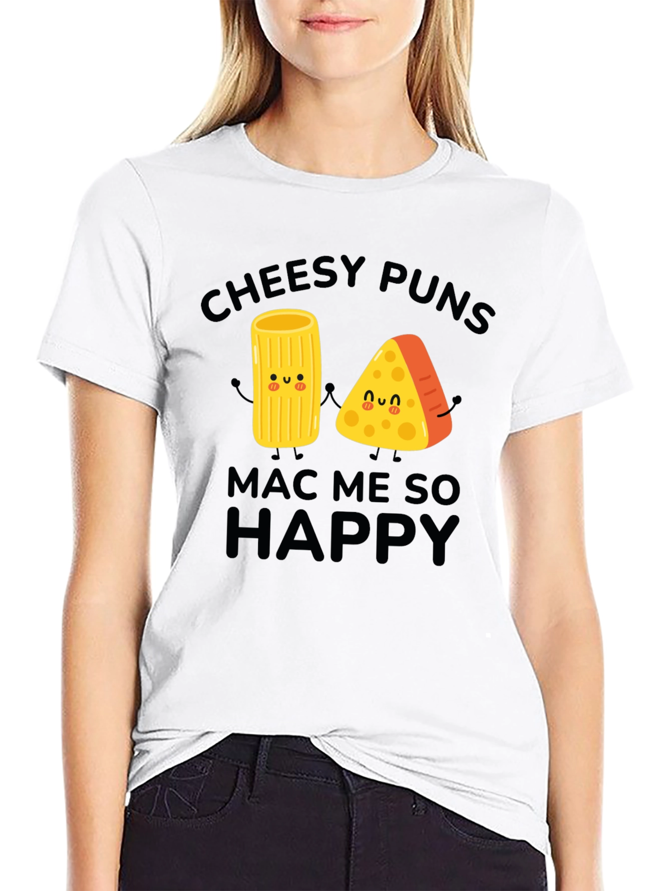 This black graphic t-shirt features a playful design with the phrase "Cheesy Puns MAC ME SO HAPPY." The design includes cute cartoon images of a macaroni pasta piece and a wedge of cheese holding hands. The design is printed on a comfortable black short-sleeved tee, making it a fun and lighthearted addition to your wardrobe. This shirt is perfect for casual wear, cheese lovers, and anyone who enjoys a good pun. Style it with jeans or shorts for a relaxed, everyday look.