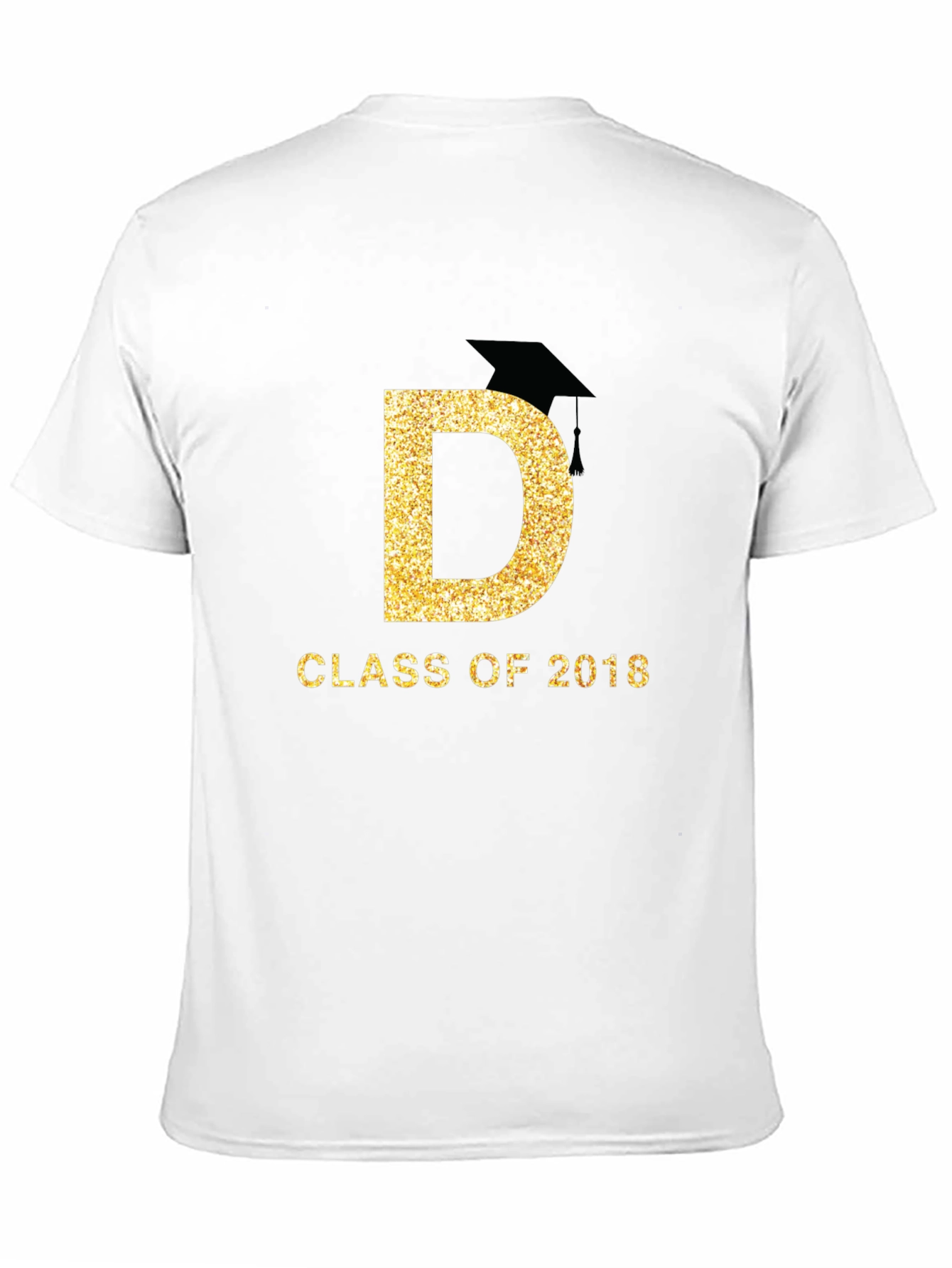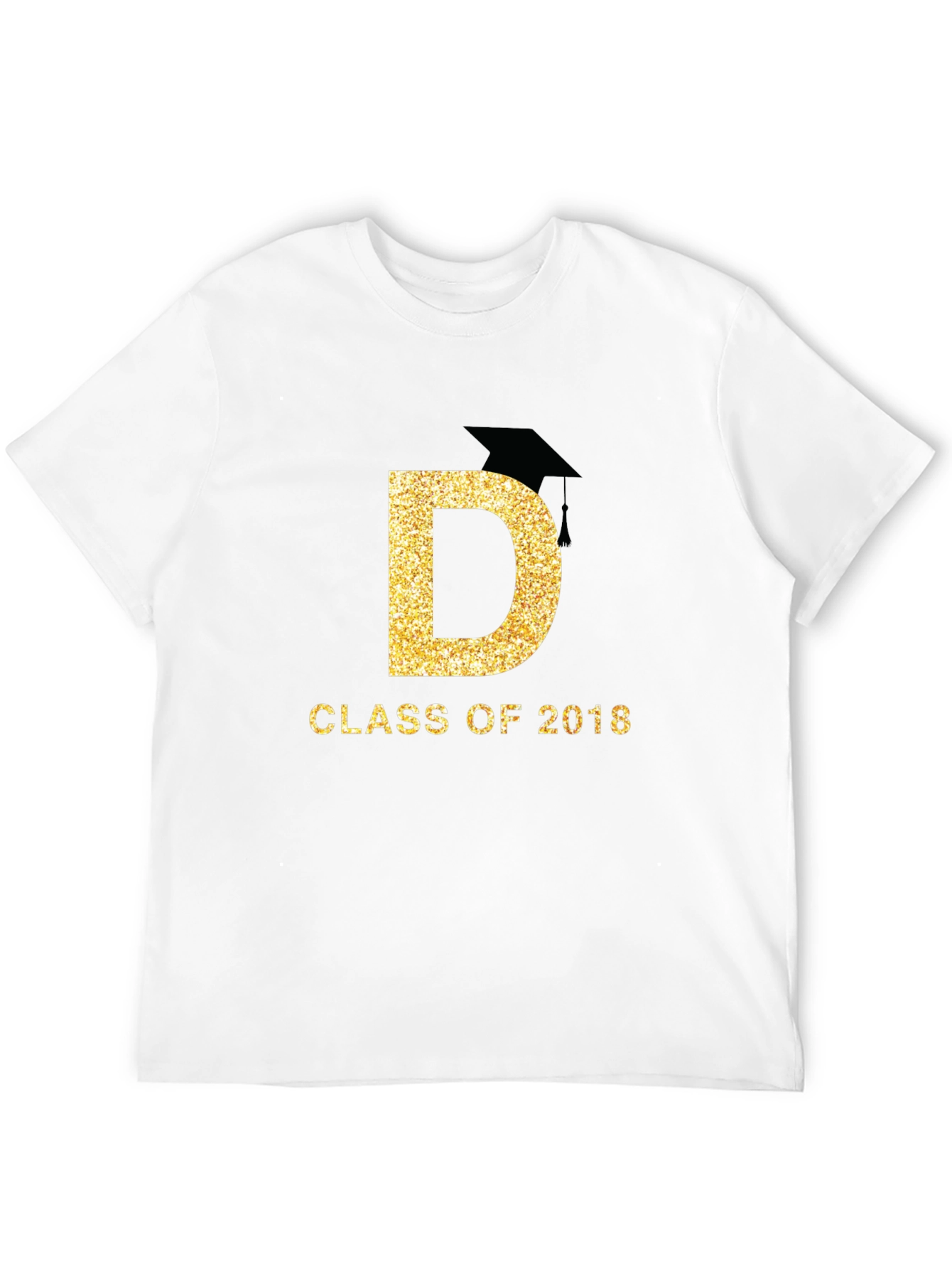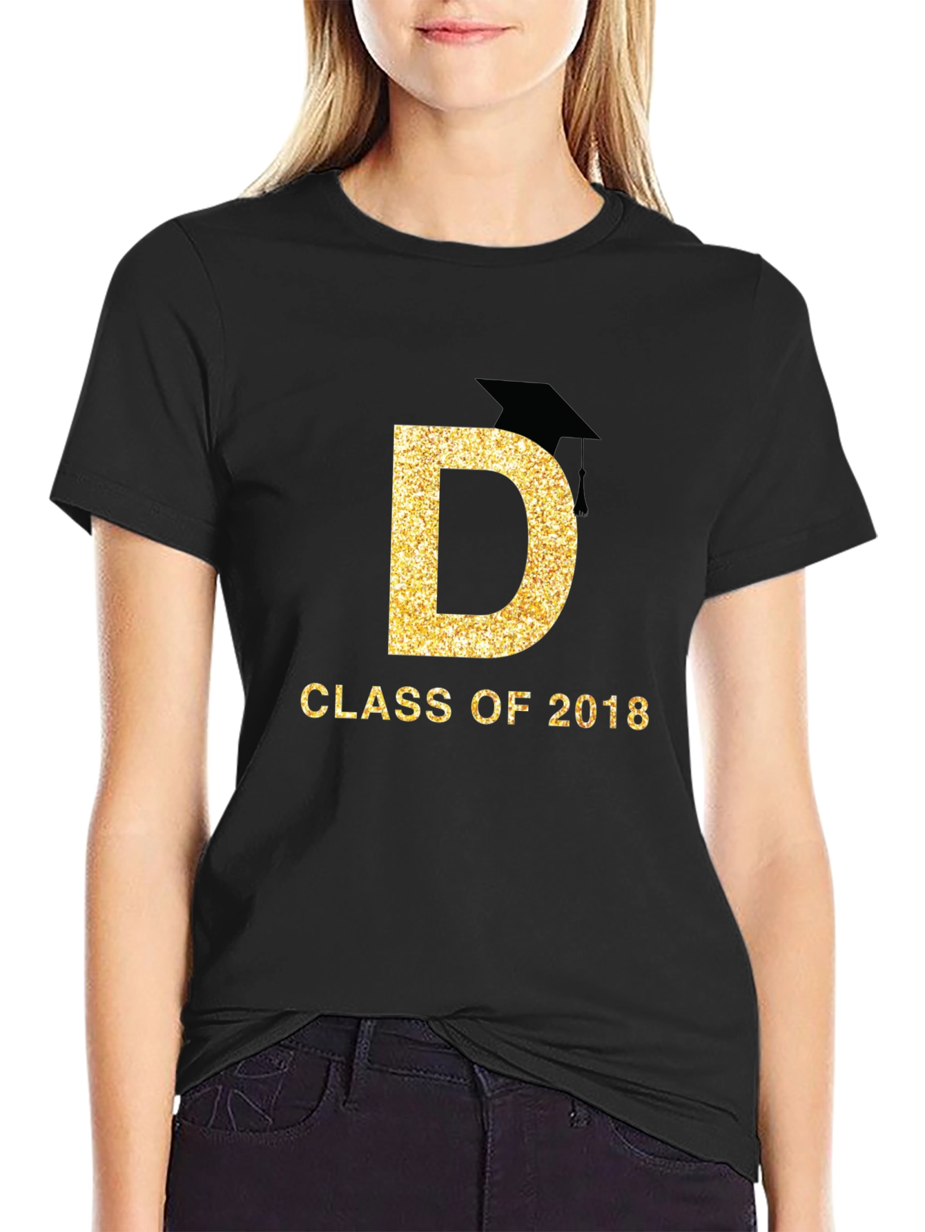 Celebrate graduation with this stylish black t-shirt! Featuring a bold, glittery gold "D" design topped with a graduation cap, this shirt proudly declares "CLASS OF 2018" in matching gold lettering. Made from a comfortable material, it's perfect for wearing to graduation ceremonies, parties, or casual outings. Show off your grad pride with this unique and eye-catching tee, a great way to commemorate your academic achievements and mark this special milestone. Order yours today and wear your success with style!