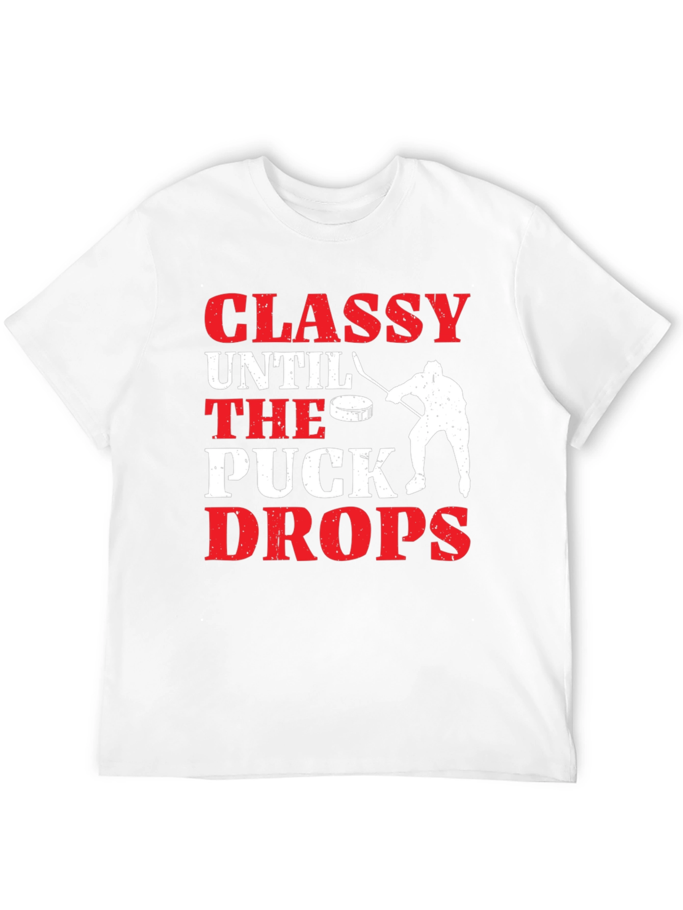 Show off your love for hockey with this eye-catching graphic t-shirt! The shirt features a bold design with the phrase "Classy Until The Puck Drops" in a striking red and white color scheme, complemented by a detailed hockey player silhouette. Made from comfortable, breathable fabric, this tee is perfect for casual wear, game days, or hitting the ice yourself. The classic black color makes it versatile and easy to pair with jeans, shorts, or athletic wear. Make a statement and let everyone know you're ready for some action when that puck drops! A must-have for any hockey enthusiast's wardrobe.
