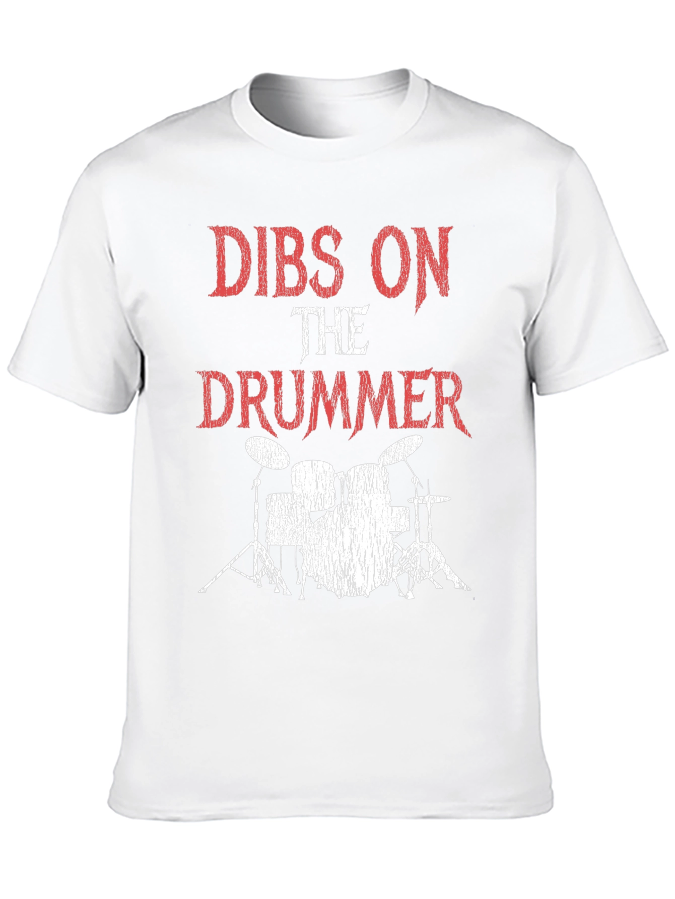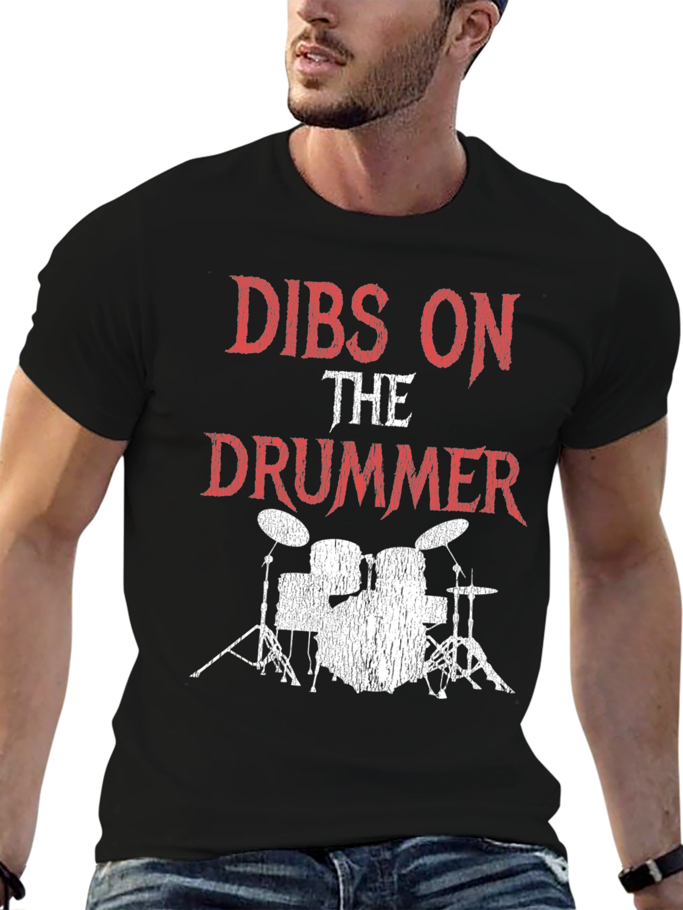 Show your love for music with this unique black graphic t-shirt. The design features a distressed-style print with the bold statement "Dibs on the Drummer" above a stylized drum set. Crafted from a soft, comfortable fabric, this tee offers a relaxed fit ideal for casual wear. Perfect for concerts, band practices, or everyday style. Let everyone know your musical preferences with this eye-catching tee. Makes a great gift for music enthusiasts or anyone who loves a cool graphic tee.
