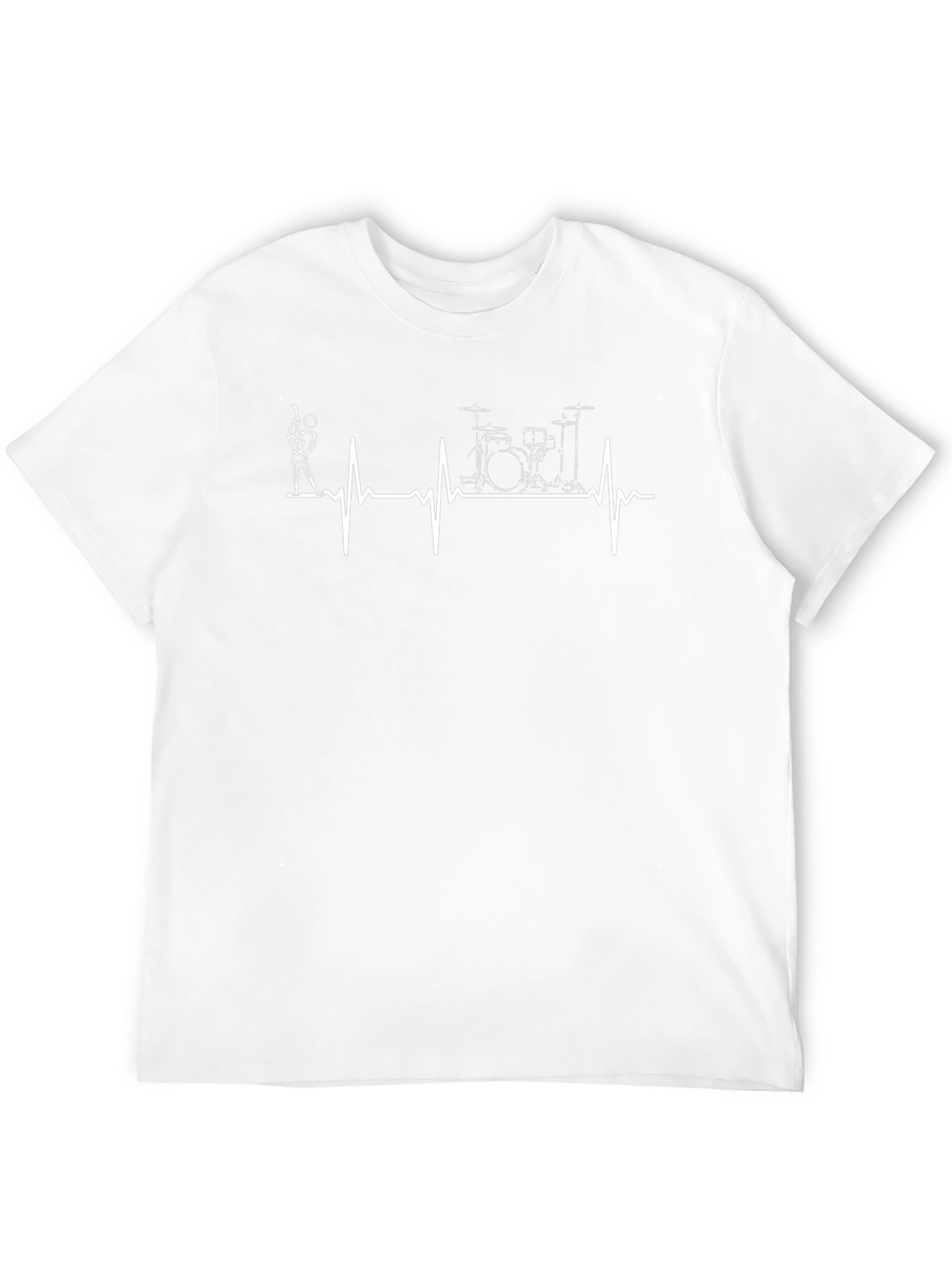 This black t-shirt features a unique design that will resonate with music lovers. A white lifeline graphic stretches across the chest, transitioning from a drummer figure to a drum set silhouette. The design suggests a heartbeat, symbolizing a passion for music and drumming. Made from what appears to be a soft, comfortable fabric, this t-shirt is perfect for casual wear. Show off your love for rhythm and music with this eye-catching and expressive tee. Ideal for everyday wear, band practice, concerts, or as a gift for the drummer in your life. It's a stylish and comfortable way to express your passion.