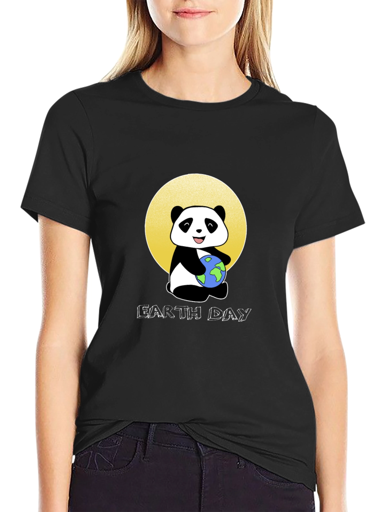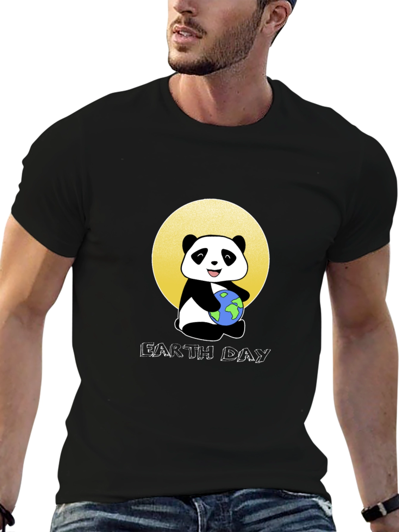 Celebrate Earth Day with this adorable black t-shirt featuring a cartoon panda hugging the Earth. The design is set against a vibrant yellow circle, adding a pop of color. Made from a soft, comfortable fabric, this tee is perfect for everyday wear. The crisp graphic print ensures longevity and style. Show your love for our planet in a fun and fashionable way. Ideal for casual outings, environmental awareness events, or simply lounging at home. Makes a great gift for eco-conscious friends and family! Get yours today and spread the Earth Day spirit.