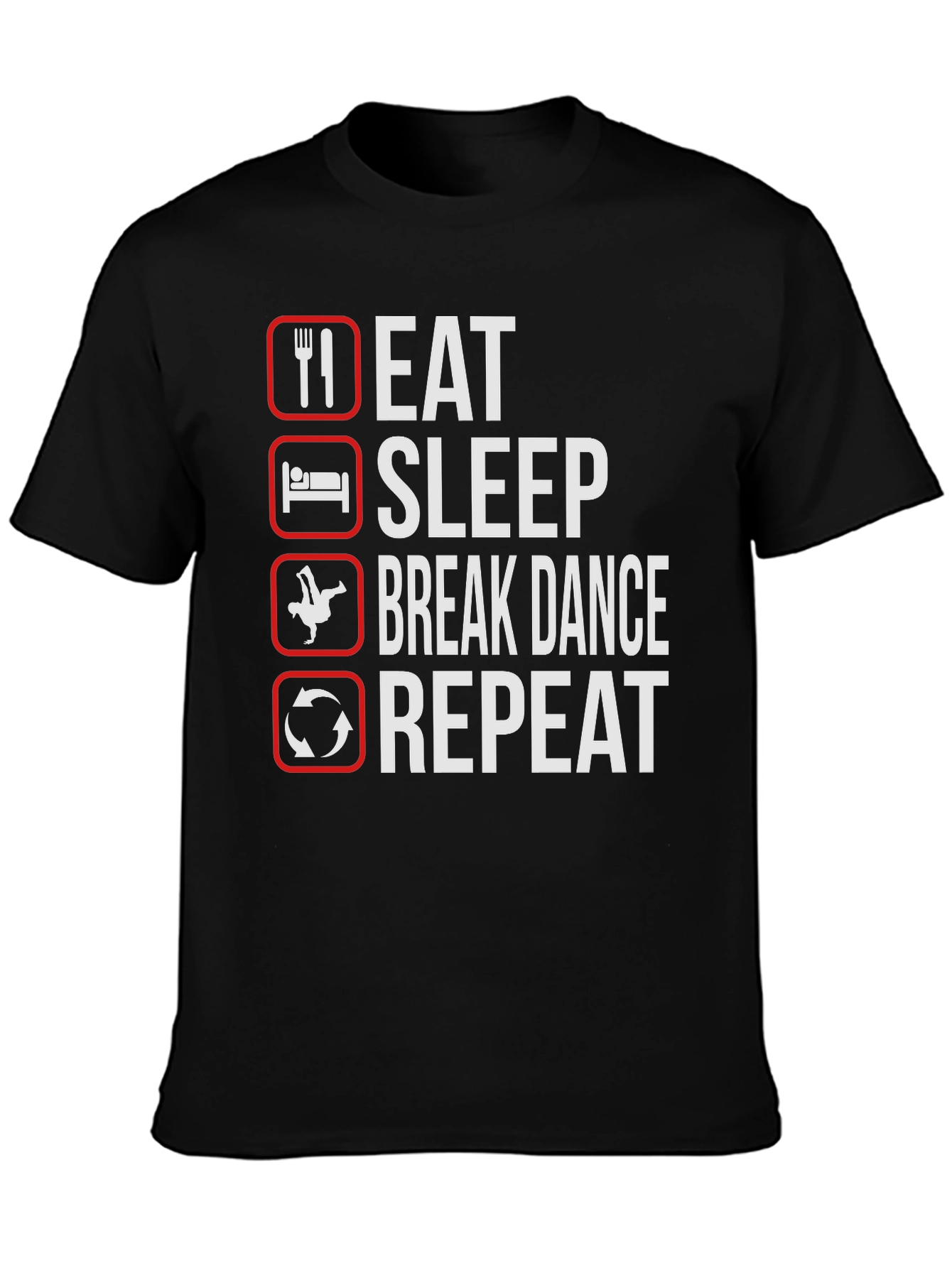 This stylish black t-shirt features a playful and energetic design perfect for breakdancing enthusiasts. The shirt showcases the phrase "Eat Sleep Break Dance Repeat" in bold white lettering, accompanied by corresponding graphic icons (fork/knife, bed, breakdancer, recycle). The design is printed on what appears to be a soft and comfortable cotton or cotton-blend fabric, offering breathability and a relaxed fit. Ideal for casual wear, dance practice, or showcasing your passion for breakdancing. This tee is sure to turn heads and spark conversations. Its versatile design also makes it a great gift for any breakdancing lover!