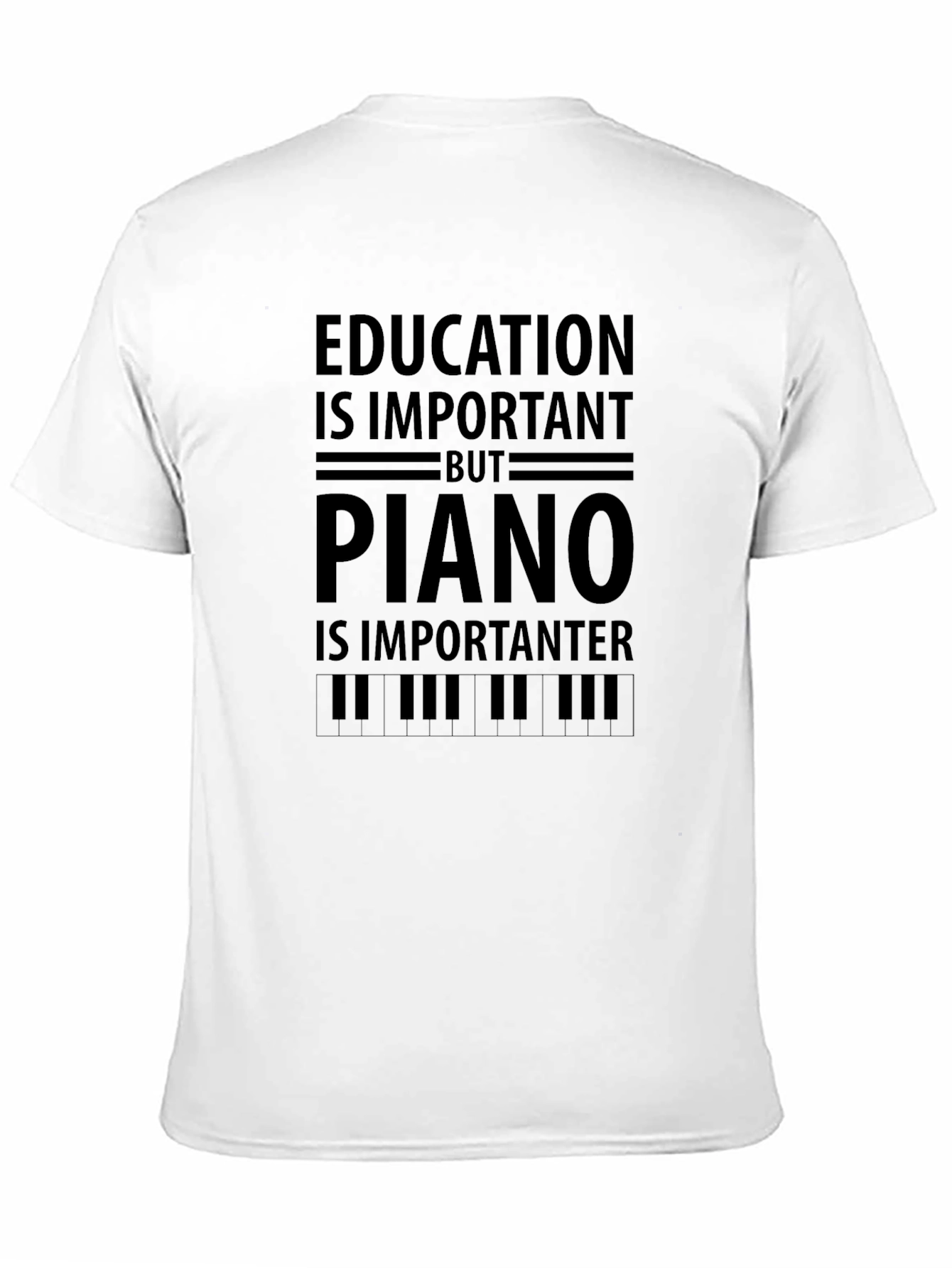 Show off your love for music with this unique graphic tee! The design features a clever message: "Education is Important BUT Piano Is Importanter," playfully emphasizing the importance of music in your life. Below the text is a minimalist piano key graphic. Made from a comfortable, breathable fabric, this t-shirt is perfect for casual wear, music lessons, rehearsals, or simply expressing your passion for the piano. A great gift for pianists, music students, or anyone who appreciates a good pun. This shirt is bound to get a smile and spark a conversation!