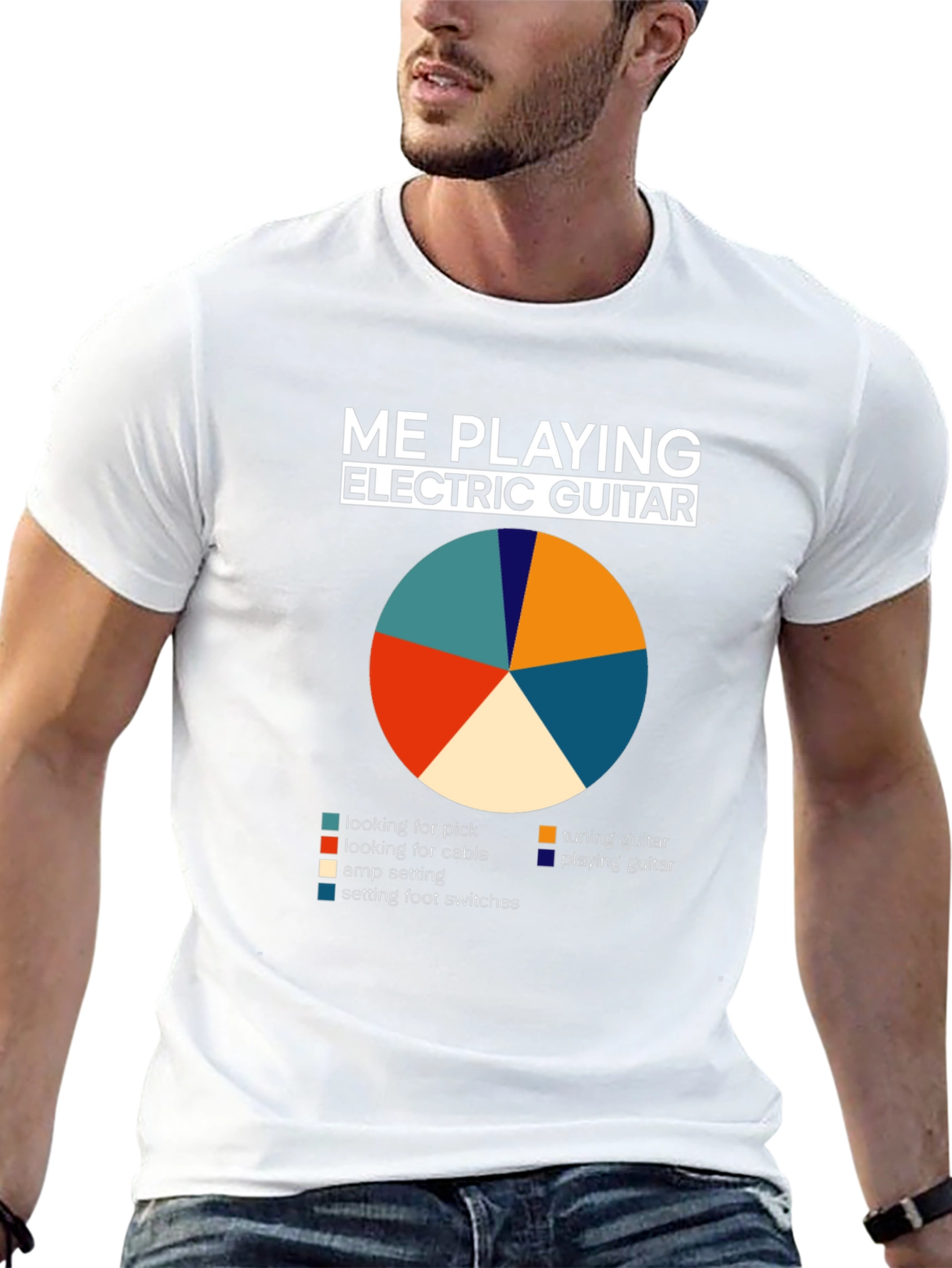 This t-shirt is perfect for any electric guitar player with a sense of humor! The black tee features a humorous pie chart graphic, detailing how an electric guitarist spends their time: looking for a pick and cable, amp settings, tuning, playing, and setting foot switches. The creative graphic is eye-catching and witty, making it a great conversation starter. Made from comfortable fabric, this shirt is ideal for casual wear, band practice, or gigs. Show off your love for playing and make fellow musicians smile with this awesome tee.