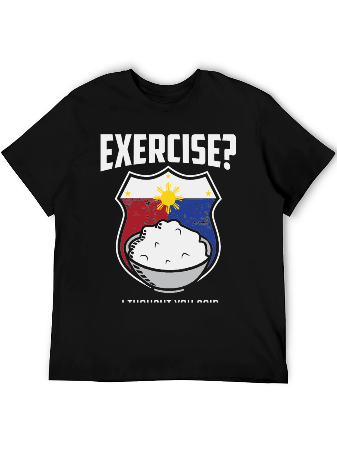 This unique black t-shirt features a bold graphic design. The focal point is a shield-shaped emblem, filled with colors reminiscent of the Philippines flag. Inside the shield is a bowl overflowing with white rice. Above the emblem, the word "EXERCISE?" is printed, and below it, a phrase is partially visible. This tee is perfect for individuals who enjoy humorous and eye-catching apparel. It's suitable for casual wear, social gatherings, or as a conversation starter. Made from comfortable fabric, it ensures a pleasant wearing experience.