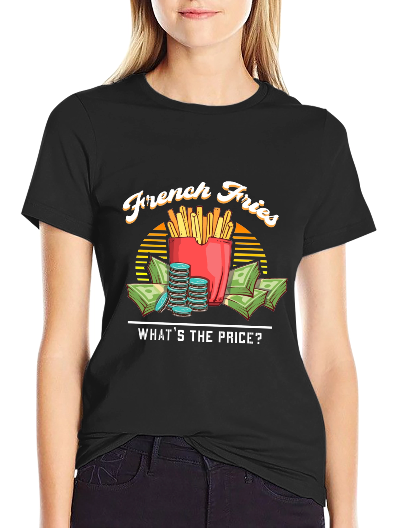 This eye-catching black t-shirt features a fun and quirky design of French fries in a red container with stacks of coins and dollar bills, implying 'What's the Price?' The design incorporates a retro sunset backdrop, giving it a vintage feel. Made from comfortable, breathable fabric, this tee is perfect for casual wear, parties, or anyone who loves fast food and humorous graphics. It is a statement piece that adds personality to your everyday style and is bound to spark conversation and laughter.