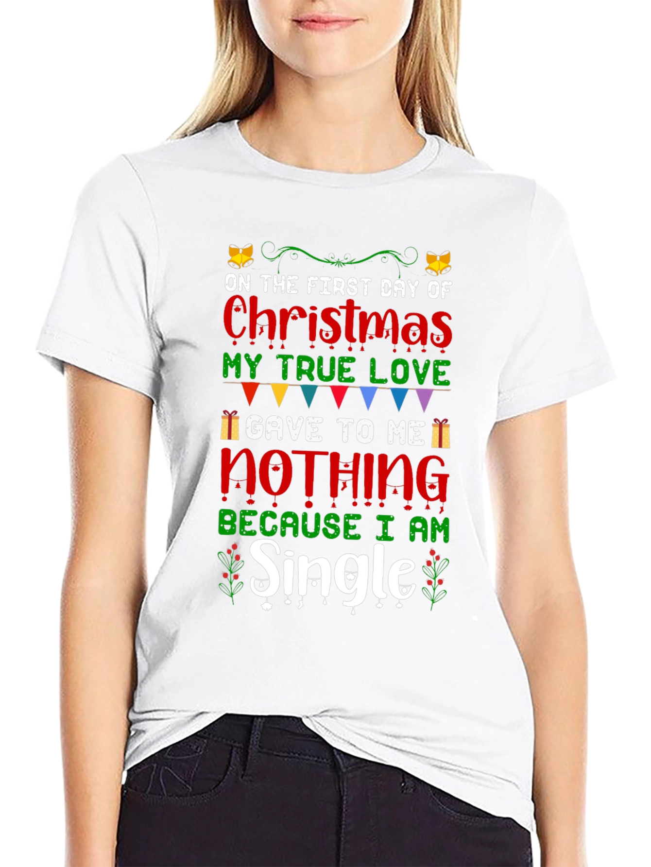 Spread some holiday cheer (and humor!) with this eye-catching black t-shirt. Featuring a festive design that reads, "On the First Day of Christmas My True Love Gave to Me Nothing Because I am Single," this shirt is perfect for anyone rocking the single life this holiday season. The design incorporates a playful mix of red, green, and white lettering, complete with whimsical Christmas accents. Made from a comfortable, breathable fabric, this tee is ideal for casual holiday gatherings, parties, or simply lounging at home. Showcase your wit and celebrate your single status with this unique and humorous Christmas t-shirt!