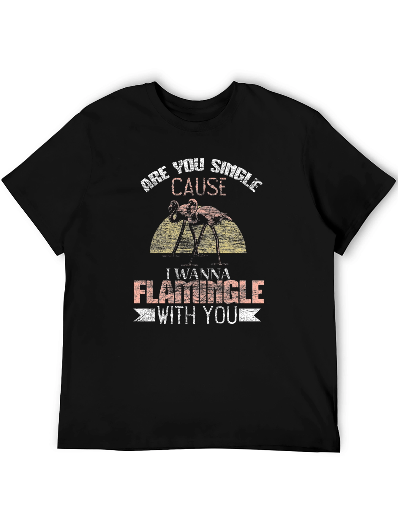 This black graphic t-shirt features a humorous design perfect for flamingo lovers. The print includes the phrase "Are You Single Cause I Wanna Flamingle With You" in a retro-inspired font, along with a graphic of flamingos silhouetted against a setting sun. The tee is made from a soft, comfortable fabric ideal for casual wear. Show off your quirky sense of humor with this unique shirt! Perfect for parties, dates, or any occasion when you want to make a statement.