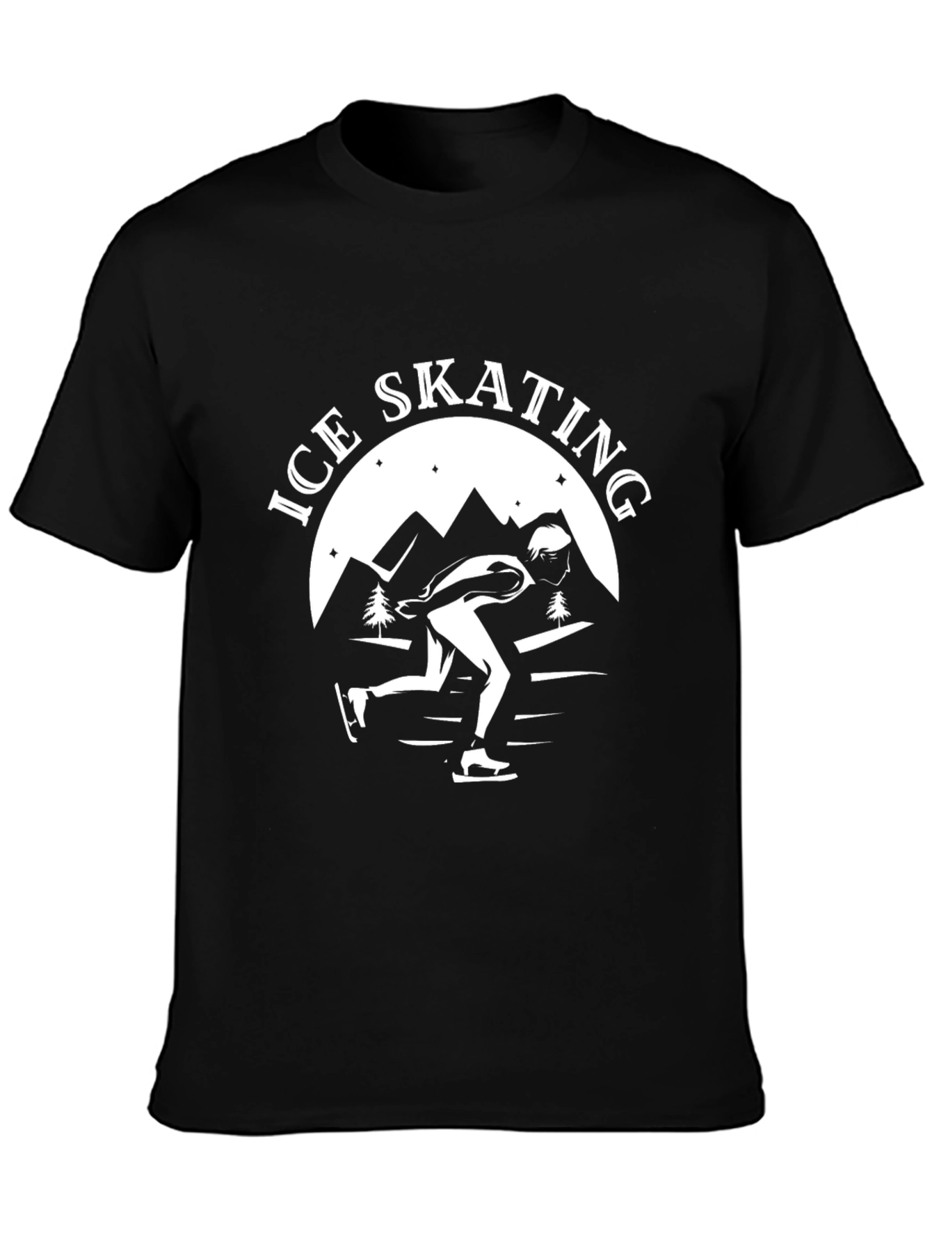 Showcase your love for winter sports with this stylish black t-shirt. The shirt features a bold, white graphic of an ice skater against a backdrop of mountains and stars, encircled by the words 'ICE SKATING'. Made from a comfortable fabric blend, this tee is perfect for casual wear, trips to the rink, or cozy evenings indoors. The classic crew neck and short sleeves ensure a timeless fit. A unique and eye-catching piece, this shirt is a great way to express your passion for ice skating. Perfect for skaters and winter sports enthusiasts alike.