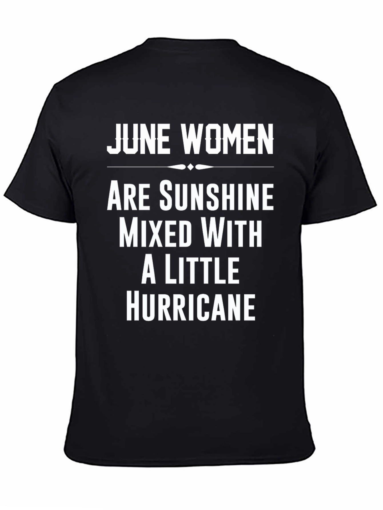 Show off your personality with this unique black T-shirt. It features a bold white graphic design that reads "JUNE WOMEN ARE SUNSHINE MIXED WITH A LITTLE HURRICANE". Perfect for those born in June who embody both warmth and a spirited nature. Made from comfortable, breathable fabric, this T-shirt offers a relaxed fit, making it ideal for everyday wear. Whether you're out with friends, running errands, or just lounging at home, this fun and stylish top is sure to turn heads and spark conversations. A perfect birthday gift for a June-born woman!