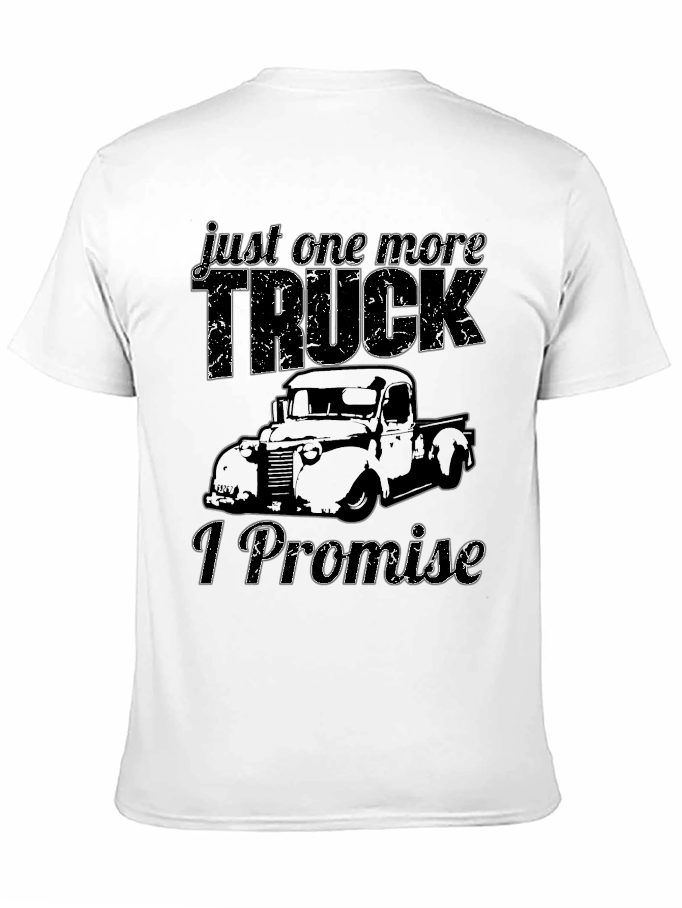 Show off your love for trucks with this humorous t-shirt. The black tee features a vintage-style truck graphic accompanied by the witty saying "Just One More Truck I Promise." Perfect for casual wear, car shows, or as a gift for truck enthusiasts. Made from comfortable materials for a great fit and lasting durability. Make a statement and get ready to turn heads with this unique and fun tee!