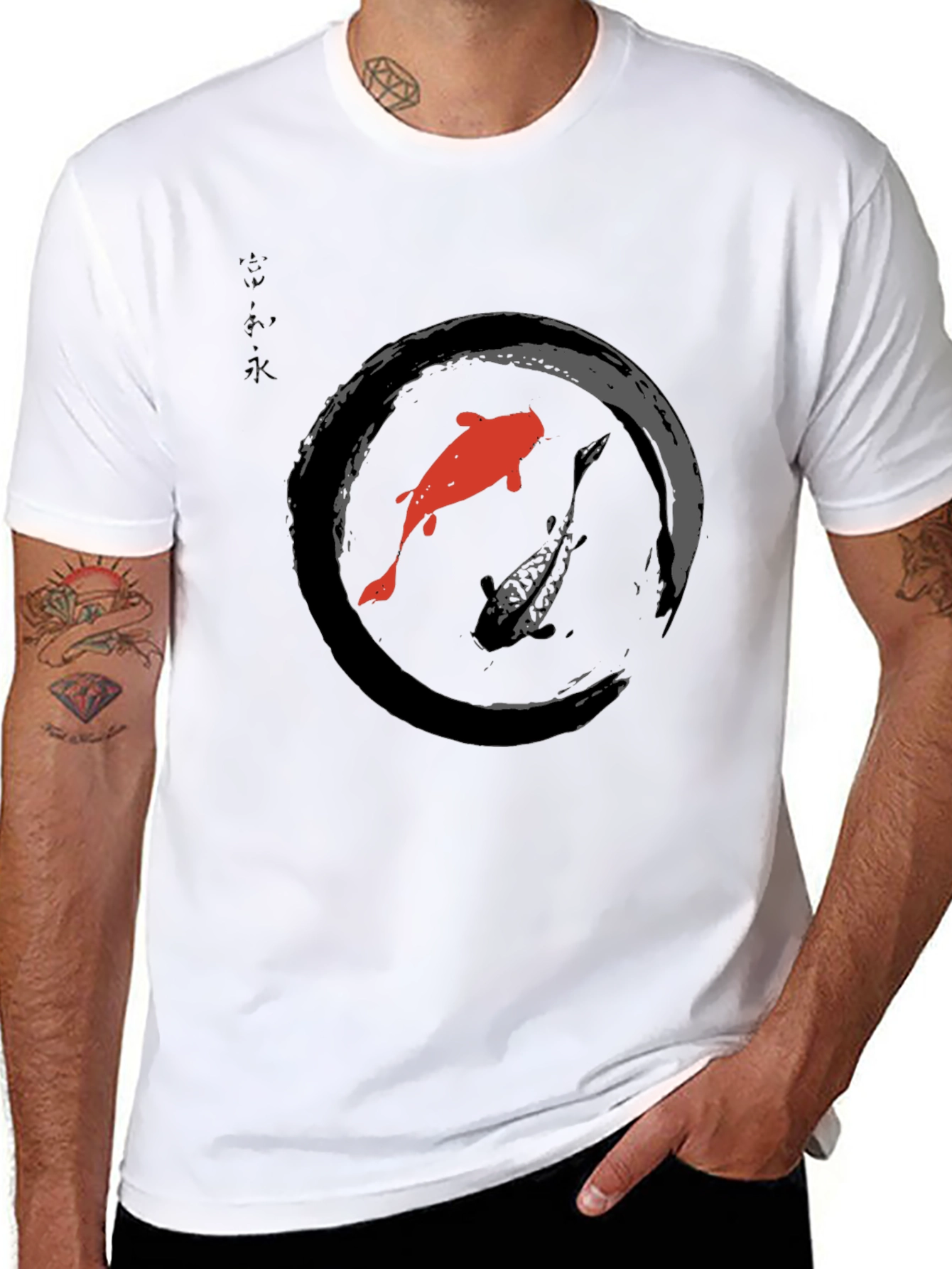 Embrace artistic style with this black t-shirt featuring a captivating graphic design. The shirt showcases a circle motif with two koi fish, one in vibrant red and the other in dark shades. Crafted from comfortable material, this short-sleeved tee offers a relaxed fit perfect for everyday wear. The unique design blends traditional art with modern fashion. Pair it with jeans or shorts for a casual yet stylish look. Ideal for those who appreciate minimalist art and comfortable clothing.