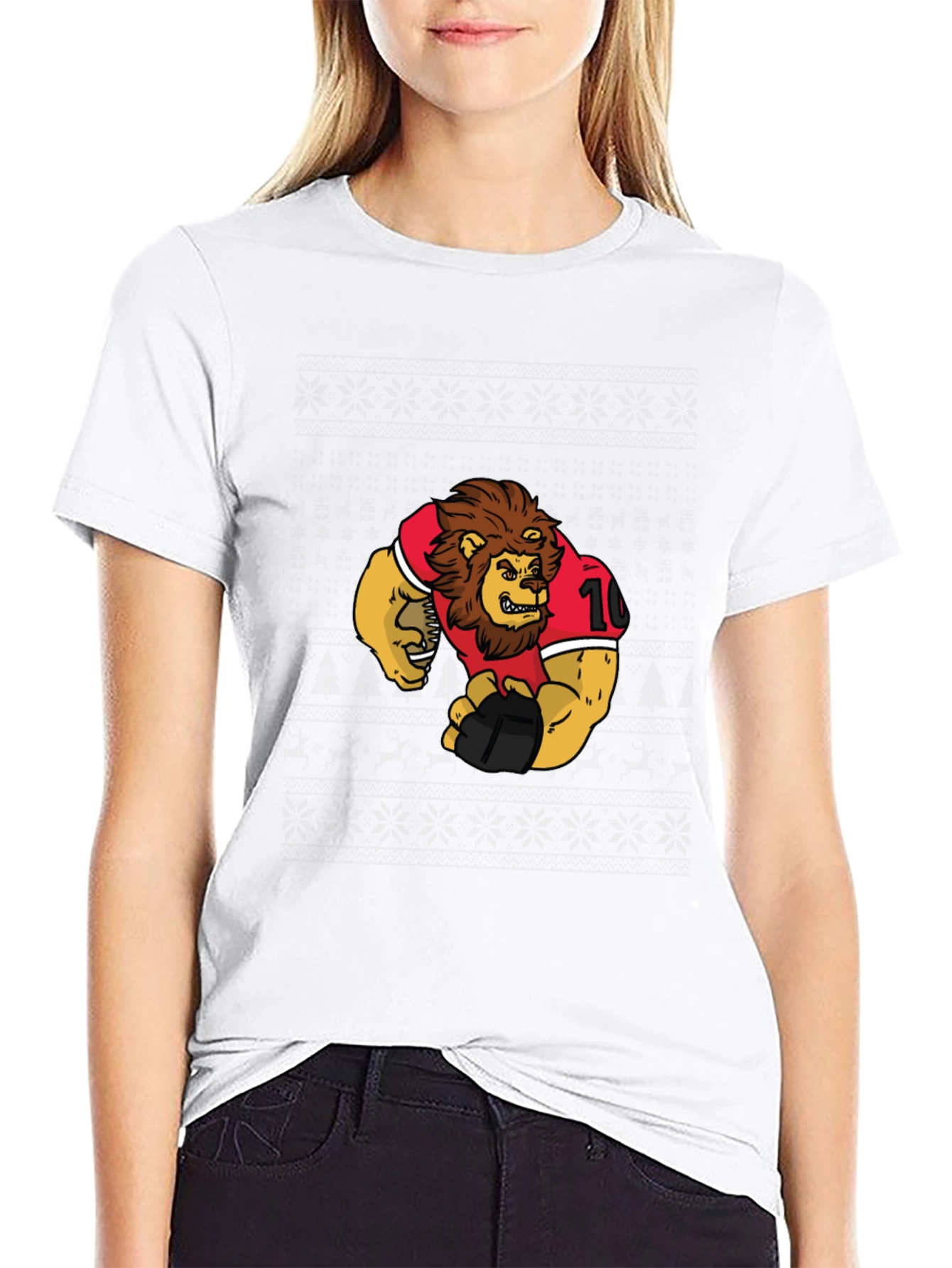 Show off your love for sports with this unique black t-shirt! This comfortable tee features a vibrant graphic of a muscular lion wearing a red football jersey, complete with a football in hand. Perfect for game days, casual outings, or simply expressing your fierce spirit. The bold design and classic fit make it a standout addition to any wardrobe. Made from a soft, breathable fabric, this t-shirt ensures all-day comfort and style. Gear up and roar with pride!