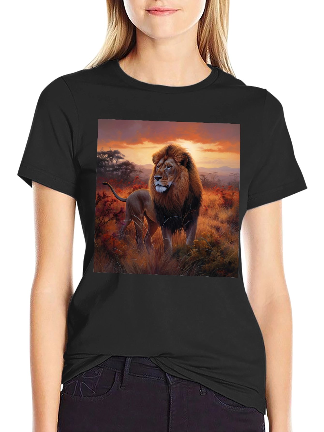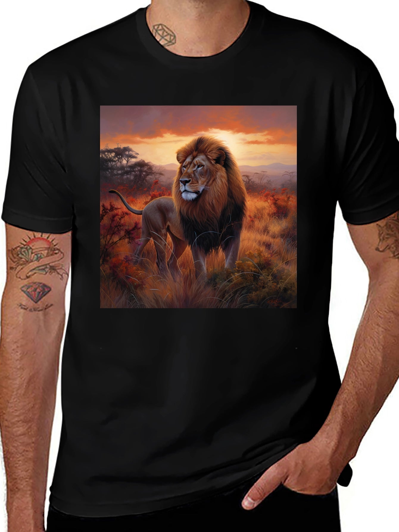 Show off your wild side with this striking black t-shirt featuring a vivid graphic of a majestic lion in its natural habitat. The detailed artwork captures the raw power and beauty of the king of the jungle, set against a stunning sunset backdrop. Made from soft, breathable fabric, this tee offers both comfort and style. Ideal for casual wear, outdoor adventures, or as a statement piece, this lion graphic tee is perfect for animal lovers and those who appreciate unique designs. Pair it with jeans or shorts for a cool, effortless look. Make a statement with this eye-catching t-shirt!