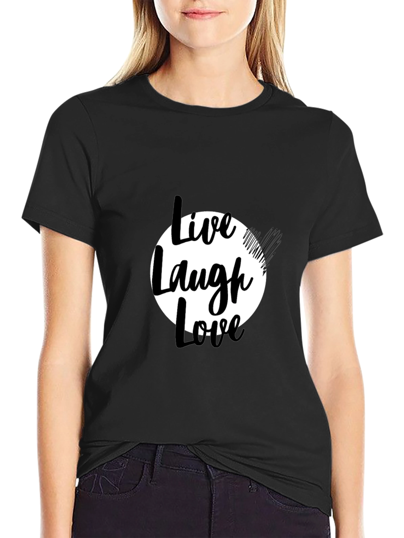Express positive vibes with this stylish black t-shirt. Featuring a crisp, white circle graphic with "Live Laugh Love" in bold black script, it's a versatile piece. The classic crew neck and short sleeves offer a comfortable fit for everyday wear. Made from soft, breathable fabric, this tee is perfect for casual outings, lounging at home, or making a statement wherever you go. Pair it with jeans, shorts, or your favorite bottoms for an effortlessly cool look that radiates positivity. It's more than just a shirt, it's a reminder to enjoy life's simple pleasures.