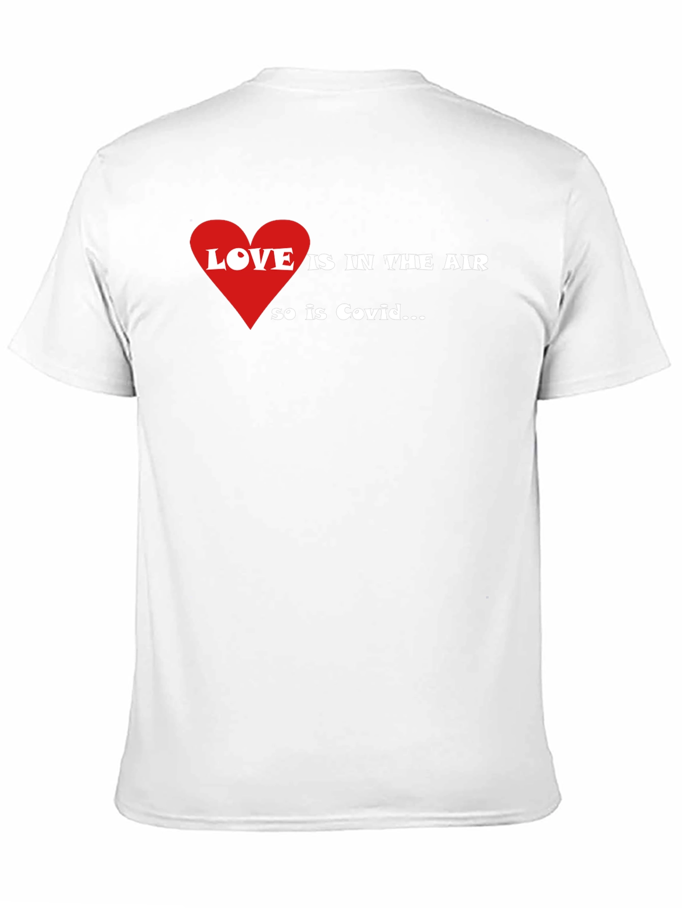 This black t-shirt features a playful yet relevant design. A vibrant red heart replaces the word 'Love' in the phrase "Love is in the Air," followed by the sobering statement "So is Covid..." in white lettering. The message is printed in a bold, easy-to-read font. Made from what appears to be a soft and comfortable cotton blend, this tee offers both style and casual appeal. It's perfect for anyone with a sense of humor, or a timely message to share. Wear it to casual gatherings, or while running errands. Guaranteed to spark conversations and maybe a few knowing nods, this unique t-shirt is a memorable and slightly ironic addition to any wardrobe.