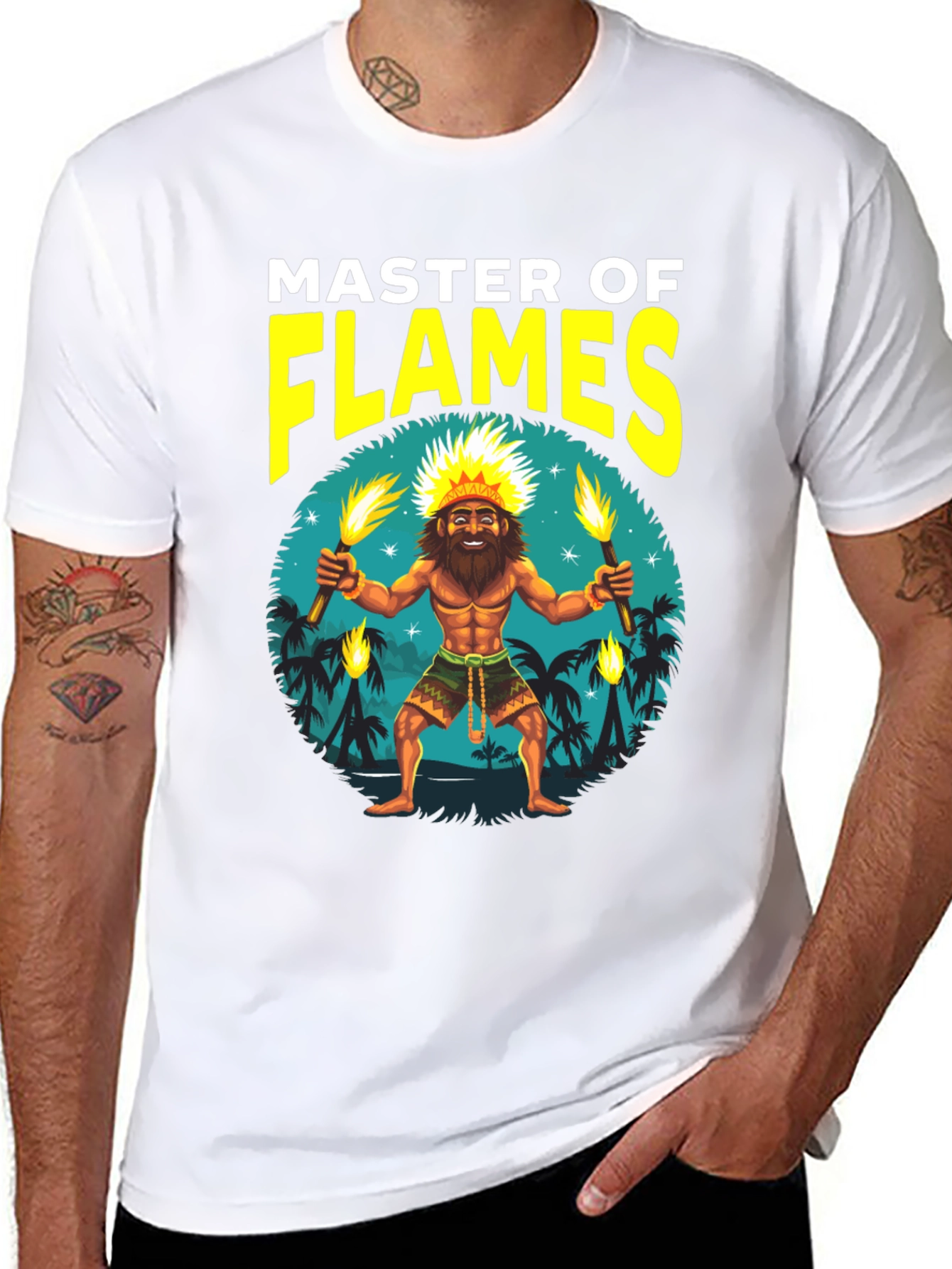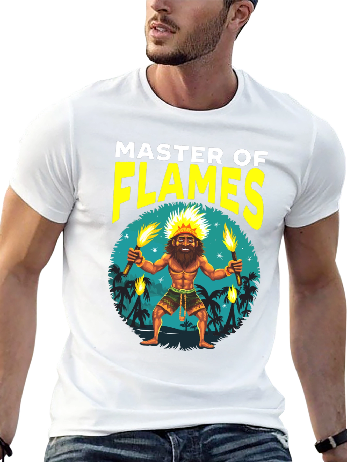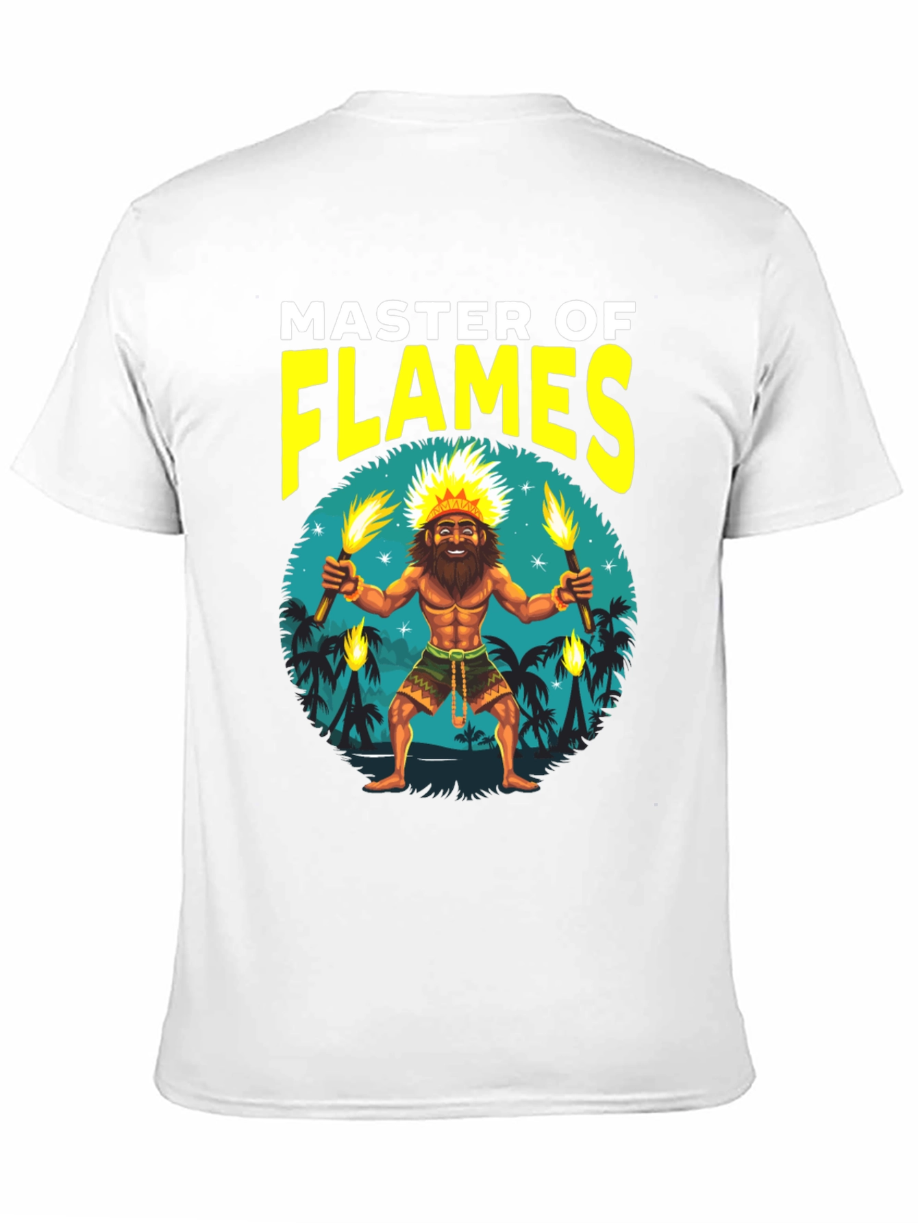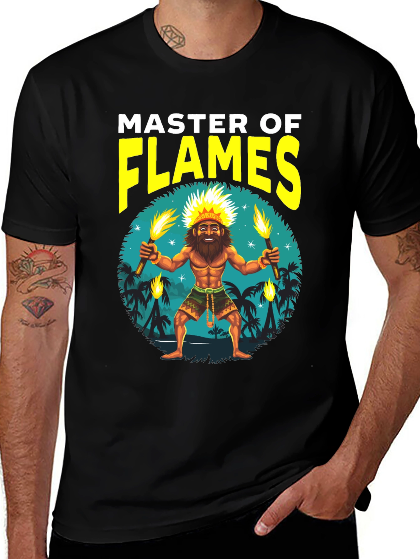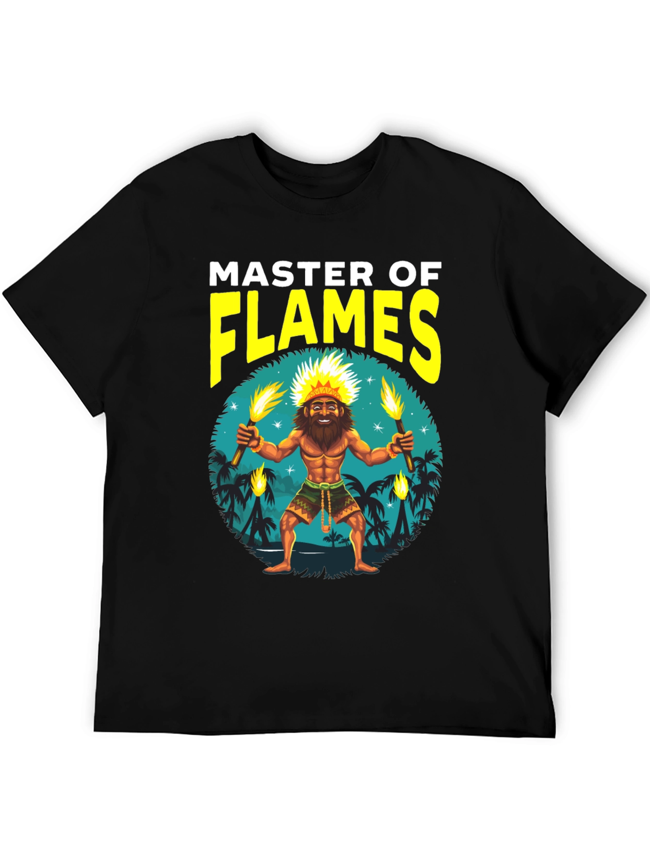 Unleash your inner fire with this eye-catching Master of Flames graphic tee. This black t-shirt features a vibrant and detailed design of a mythical figure surrounded by flames and palm trees, creating a bold and captivating visual. The striking yellow "Master of Flames" text adds a touch of humor and personality to your wardrobe. Made from a soft and comfortable fabric, this tee is perfect for casual outings, concerts, or just lounging around. Express your unique style and ignite conversations with this standout t-shirt.