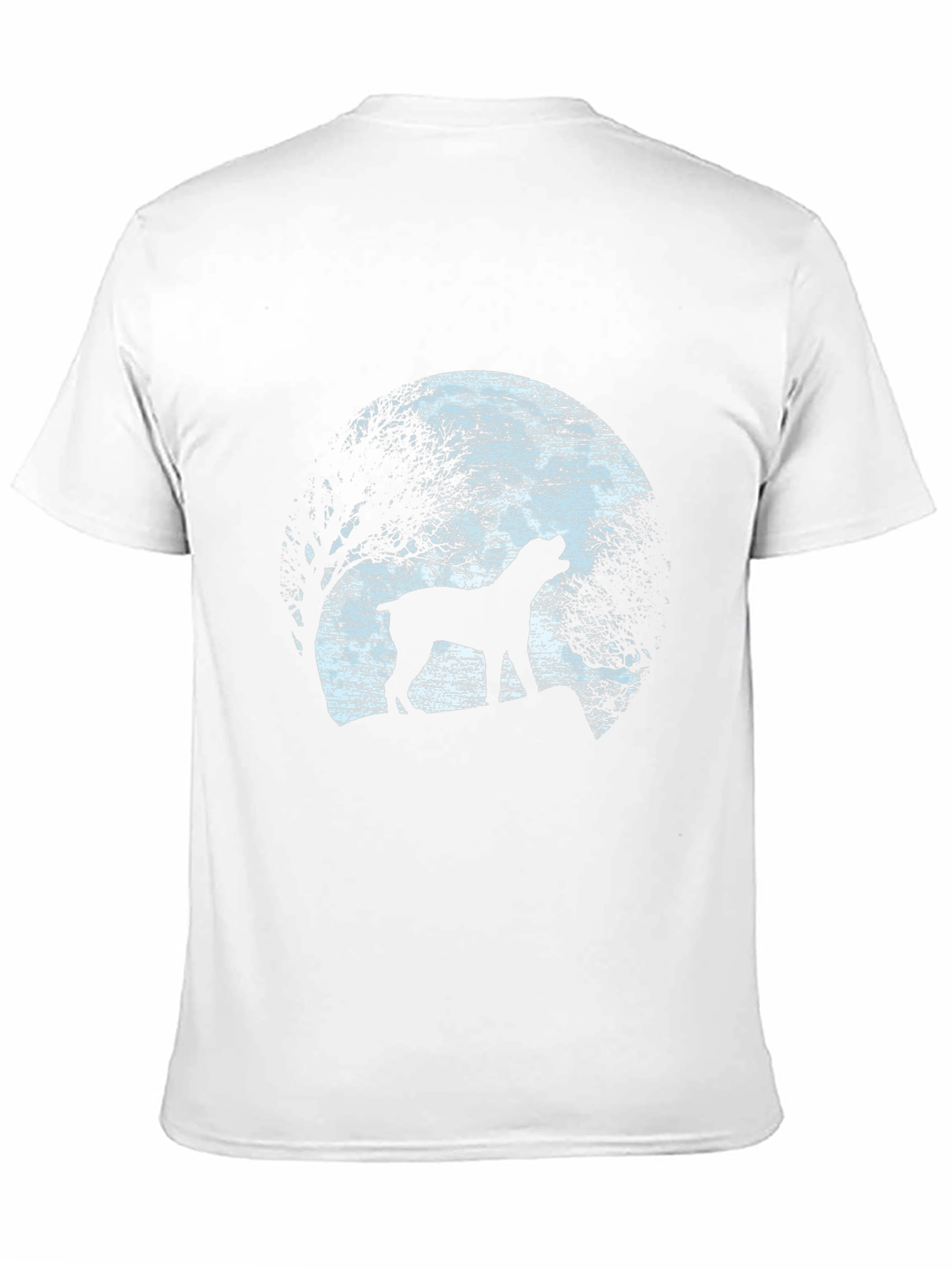 This stylish men's black t-shirt features a striking silhouette graphic. The design showcases a dog standing beneath trees against a faded, circular backdrop, creating a cool, moonlit effect. The shirt has a classic crew neck and short sleeves for a comfortable, casual fit. Made from a soft-looking fabric, this tee is perfect for everyday wear, whether you're hanging out with friends, running errands, or simply relaxing at home. Its unique design adds an edgy touch to any outfit. Show off your love for dogs and nature with this eye-catching graphic tee.