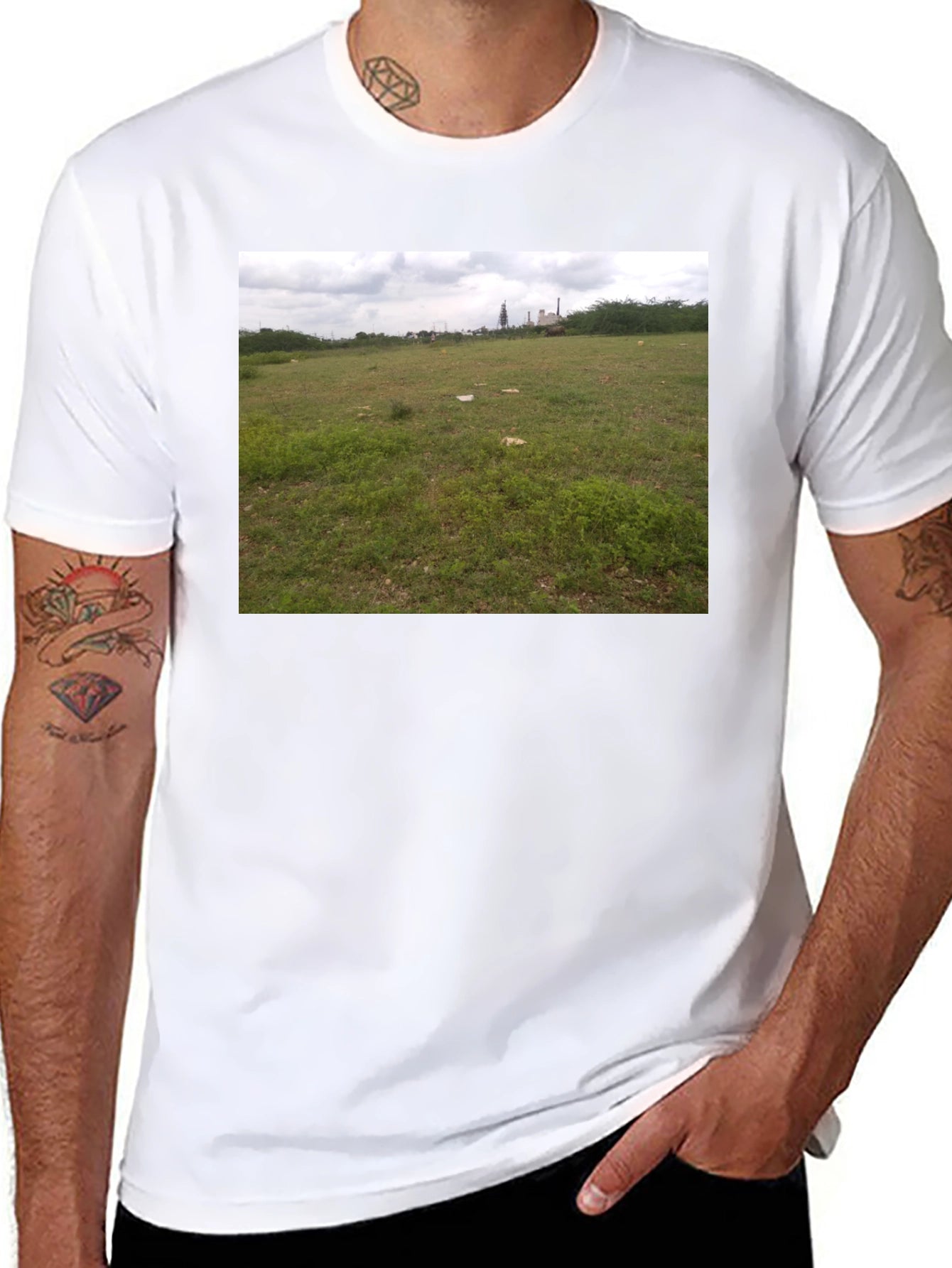 Show off your love for nature with this unique black t-shirt. Featuring a vivid print of a tranquil field scene, complete with green grass, a cloudy sky, and distant structures, this tee is perfect for casual wear. The high-quality print ensures the image remains vibrant, even after multiple washes. Made from comfortable, breathable fabric, this shirt offers a relaxed fit that is ideal for everyday use. Whether you're out for a stroll or relaxing at home, this eye-catching nature scene t-shirt is sure to turn heads and spark conversations. Add a touch of outdoor serenity to your wardrobe today!