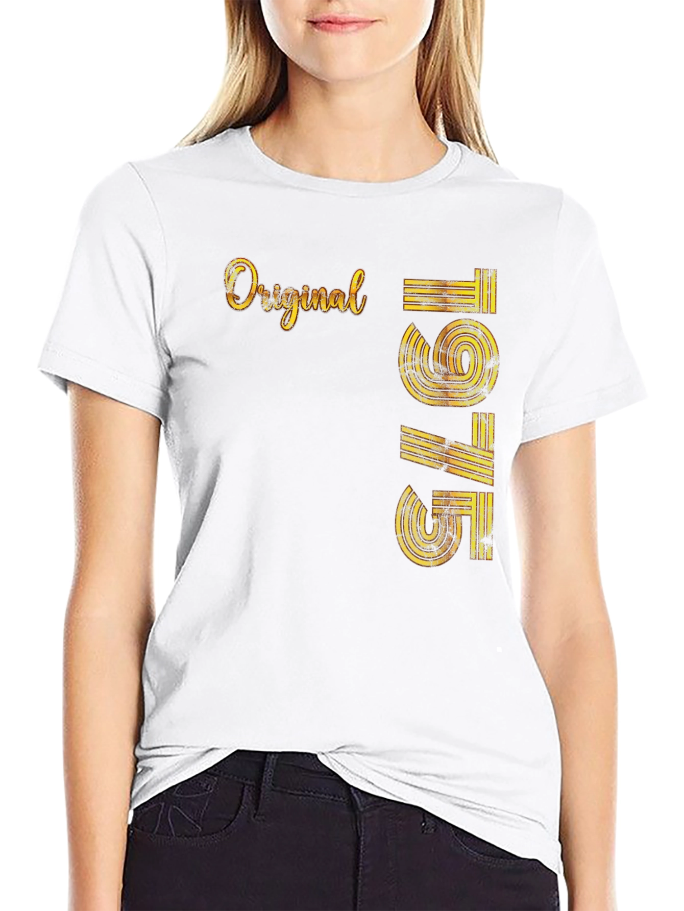 Show off your vintage style with this bold, black t-shirt featuring "Original 1975" in a distressed, golden-yellow retro design. The eye-catching graphic adds a touch of nostalgia, while the classic fit and comfortable fabric make it ideal for everyday wear. Perfect for birthdays or just showing off your birth year in style. This tee is sure to turn heads. Add it to your wardrobe today!