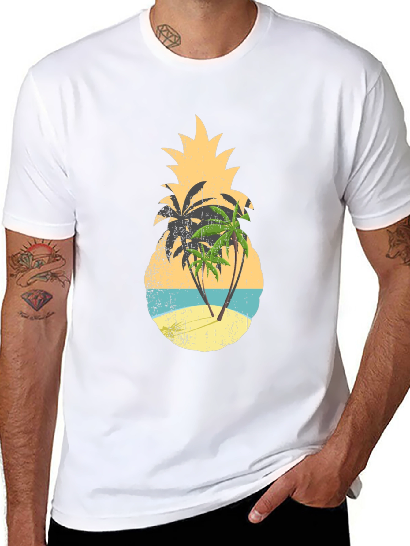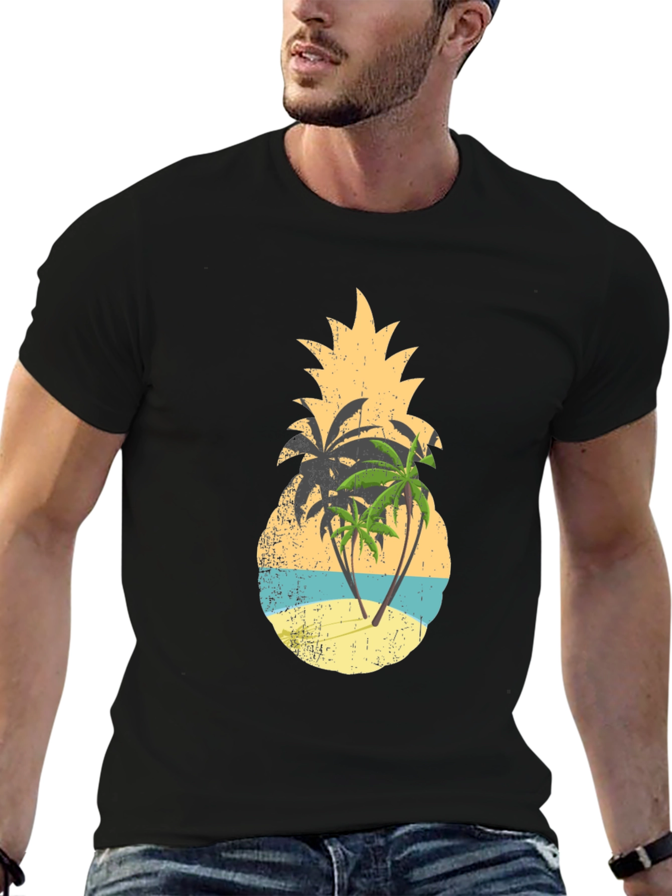 Embrace tropical vibes with this stylish black t-shirt featuring a unique pineapple design. The graphic art incorporates a beach scene with palm trees set inside the pineapple shape, creating a cool island aesthetic. Made from a comfortable, lightweight fabric, this tee is perfect for casual wear, beach outings, or adding a touch of summer to your everyday style. The distressed print adds to the vintage feel of the shirt. Show off your love for the beach and stand out with this eye-catching design.