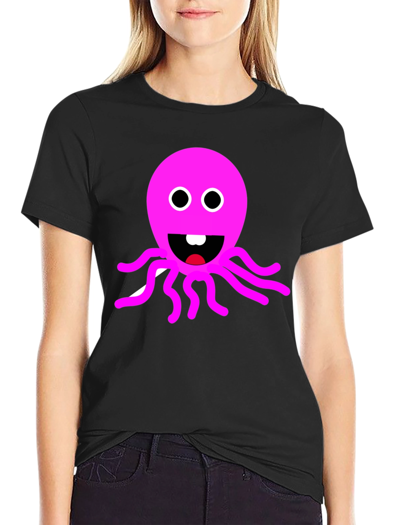 Show off your playful side with this unique black t-shirt featuring a bright pink octopus graphic. This eye-catching design includes a cartoon octopus with a cheerful expression, making it a fun and quirky addition to your wardrobe. The shirt is made of a soft, comfortable fabric, perfect for casual wear, outings with friends, or adding a pop of fun to any outfit. Its relaxed fit makes it ideal for everyday wear, while the durable print ensures the design stays vibrant wash after wash. Stand out from the crowd with this bold, conversation-starting tee!