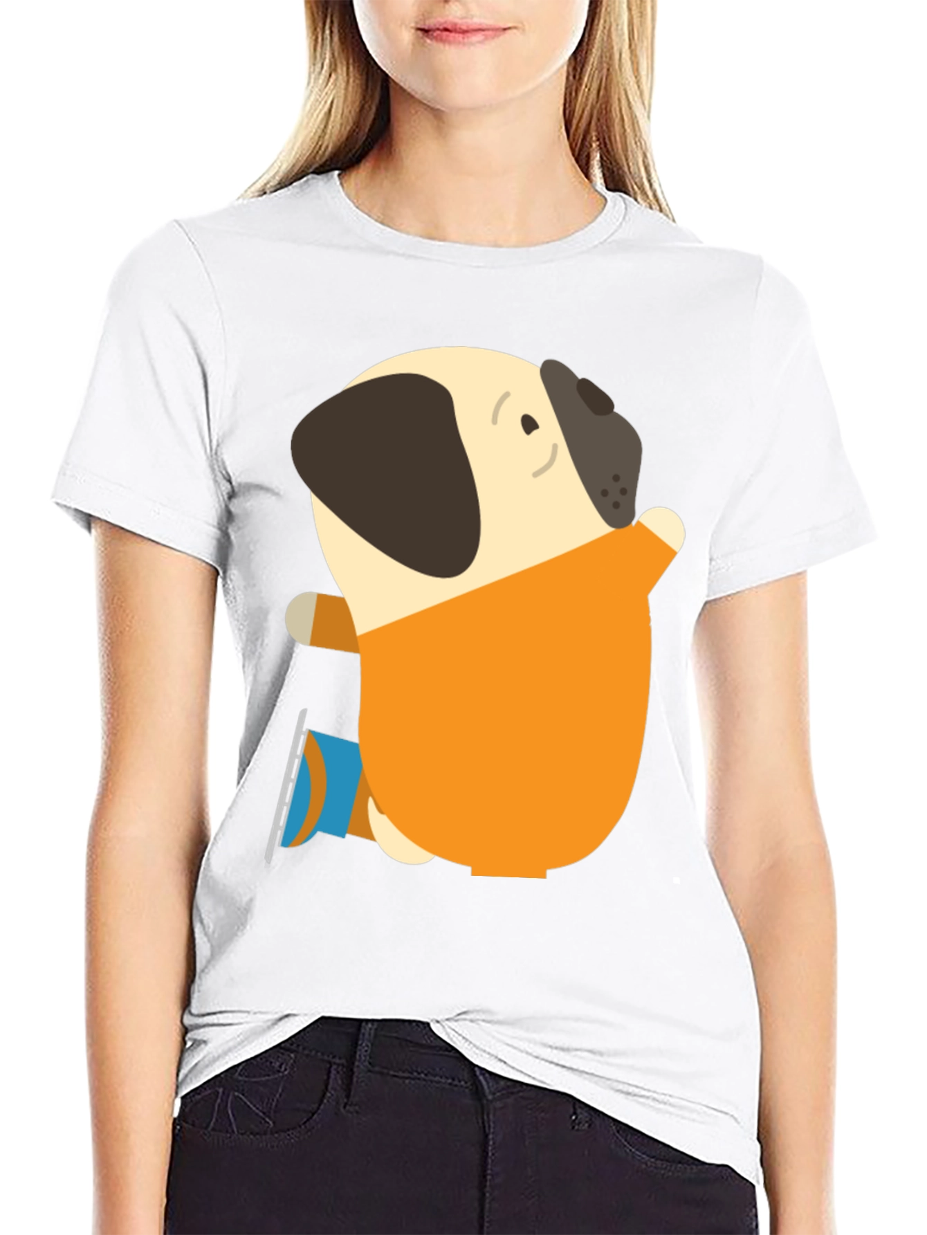 Show off your quirky side with this unique graphic t-shirt! This black tee features a cute cartoon pug character donning ice skates and a playful orange outfit. Made from a comfortable material, this shirt is perfect for casual wear, whether you're heading out with friends, running errands, or just relaxing at home. The eye-catching design is sure to spark conversation and add a touch of fun to your everyday wardrobe. A great gift for dog lovers and those with a sense of humor. Add this charming piece to your collection today!