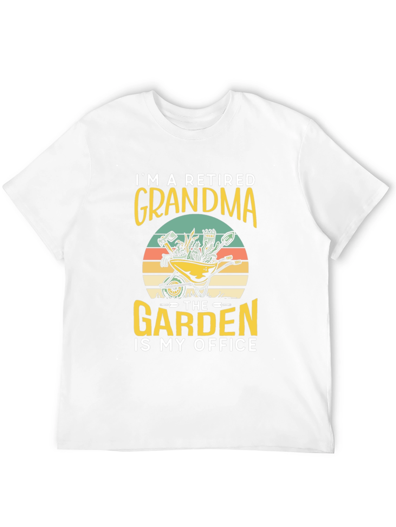 Show off your love for gardening with this comfortable black t-shirt! This tee features a vibrant graphic of a wheelbarrow filled with gardening tools set against a retro sunset background. Above, the words "I'M A RETIRED GRANDMA" are printed in a cheerful yellow font, with the phrase "THE GARDEN IS MY OFFICE" below. Perfect for retired grandmas who love spending time in their garden, this shirt is both stylish and practical. Wear it while tending to your plants, running errands, or simply relaxing at home. It also makes a thoughtful and unique gift for the gardening enthusiast in your life. Get yours today!