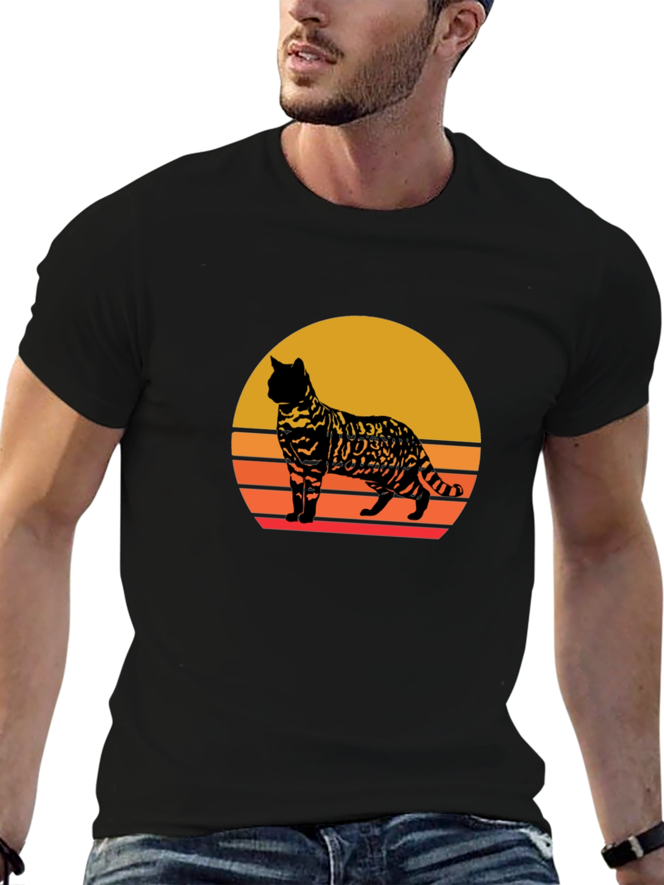 Embrace vintage vibes with this eye-catching black t-shirt. Featuring a bold graphic of a cat silhouette set against a retro sunset backdrop with orange and yellow hues, this tee is a unique style statement. Made from comfortable, breathable fabric, it’s perfect for everyday wear. The unisex design makes it a great fit for anyone who loves cool, casual fashion. Pair it with jeans, shorts, or a skirt for an effortlessly stylish look. Stand out from the crowd with this distinctive graphic tee!