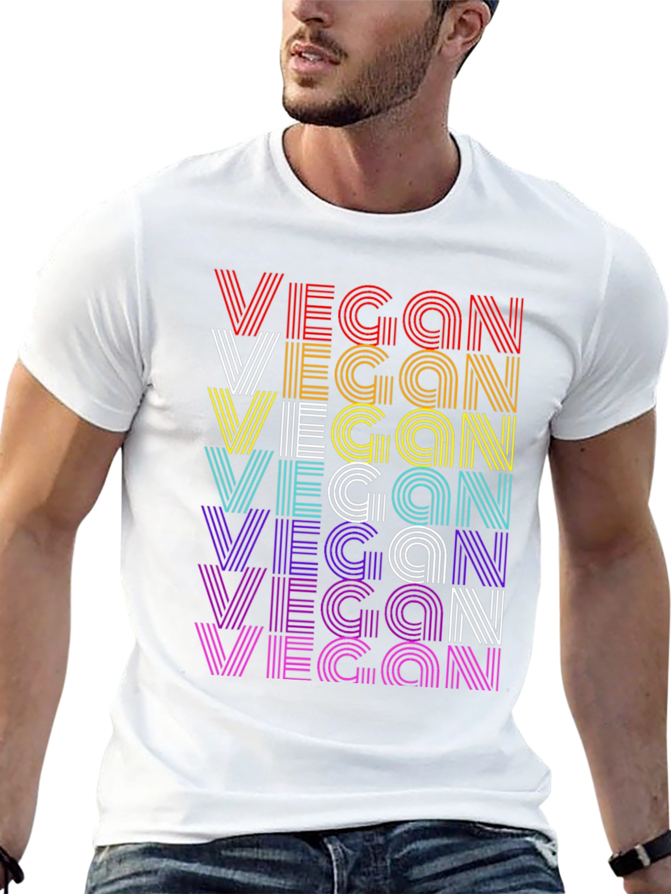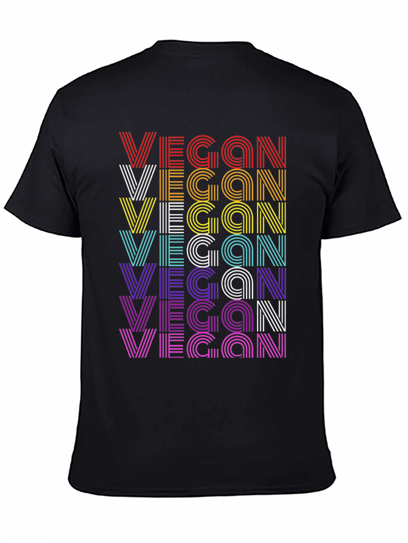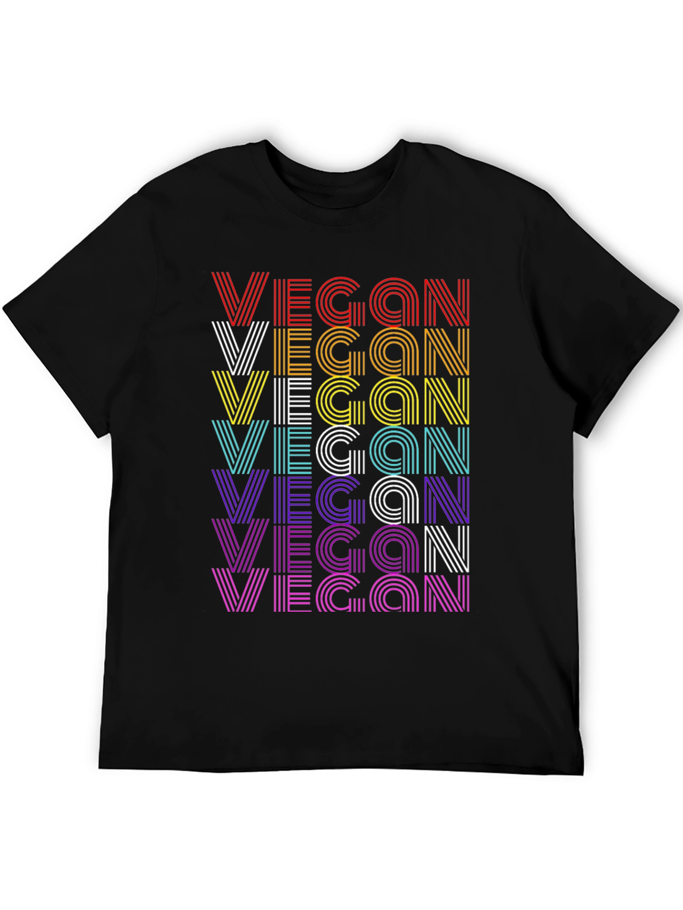 Show your plant-based pride with this stylish black t-shirt. The design features the word 'VEGAN' repeated multiple times in a vibrant, retro-inspired stripe pattern. Each line of 'VEGAN' is colored differently, creating a rainbow effect with hues of red, orange, yellow, white, cyan, purple, and magenta. The classic crew neck and short sleeves make it a versatile choice for everyday wear. Made from comfortable, breathable fabric, this tee is perfect for casual outings, vegan events, or simply spreading awareness. Embrace your vegan lifestyle with this eye-catching and comfortable tee!
