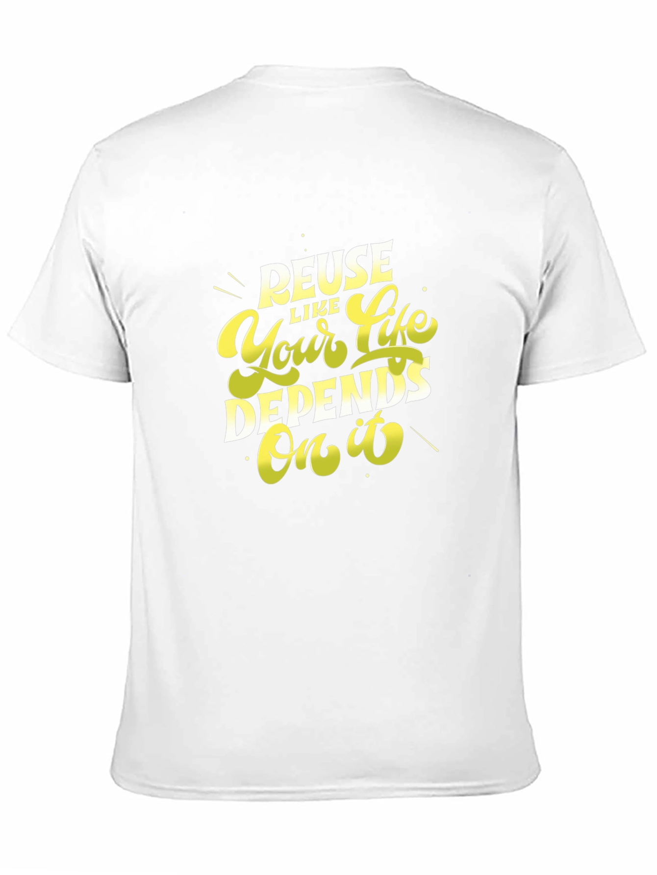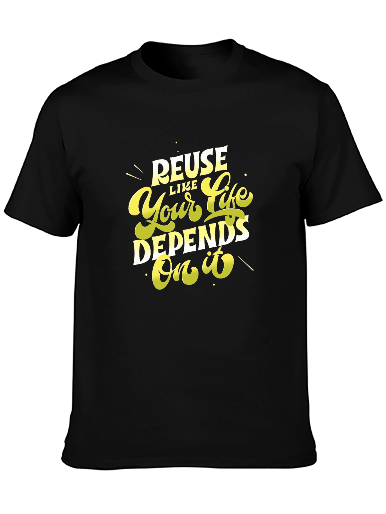This striking black t-shirt features a bold, eye-catching graphic that promotes sustainability. The text "REUSE Like Your Life DEPENDS on it" is displayed in a stylized, layered font with a yellow to white gradient, creating a vibrant and positive message. The t-shirt has a classic fit with short sleeves and a crew neck, making it comfortable and versatile for everyday wear. Made from what appears to be soft, breathable cotton, this t-shirt is perfect for environmentally conscious individuals who want to make a statement. Wear it casually with jeans or dress it up with a jacket for a socially responsible and stylish look. Ideal for environmental activism events or casual wear.