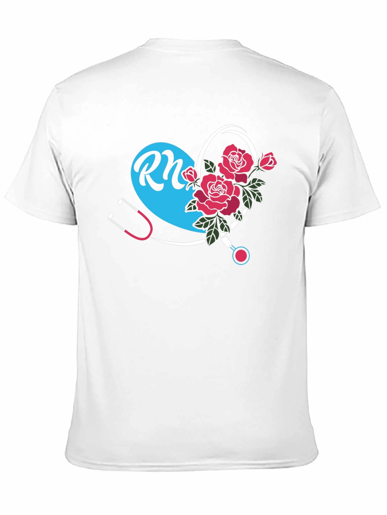 Show your appreciation for nurses with this stylish black graphic tee. It features a unique design with a light blue heart backdrop and the letters "RN" overlaid. The design incorporates a stethoscope in a heart shape intertwined with beautifully detailed red roses and green leaves. The print conveys care, dedication, and compassion with its design. Made from a soft, comfortable fabric, this tee is perfect for everyday wear, whether you're at work, running errands, or relaxing at home. Makes a great gift for nurses or nursing students!