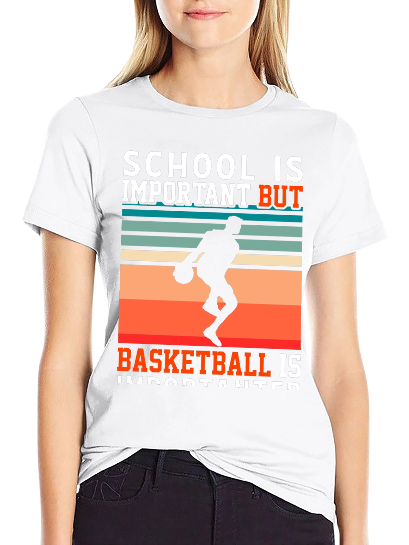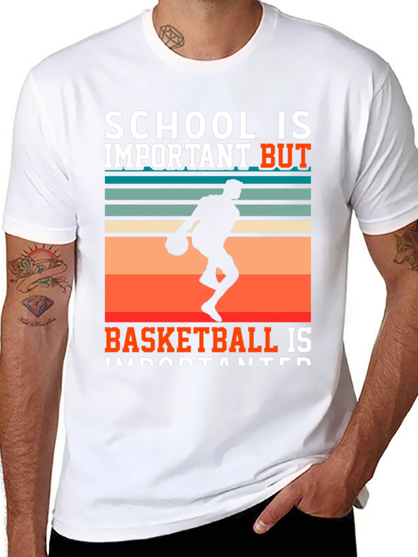 This black t-shirt features a bold graphic design perfect for basketball enthusiasts. The design includes a vintage-style background with horizontal stripes in teal, beige, and orange, showcasing a silhouette of a basketball player. Above and below the graphic it reads, "School is Important BUT Basketball is Important." The tee is made from a comfortable-looking fabric, ideal for everyday wear. Whether you're hitting the court or just showing off your love for the game, this t-shirt makes a statement. A great gift for young athletes and basketball fans. Style and comfort meet with this unique graphic tee.