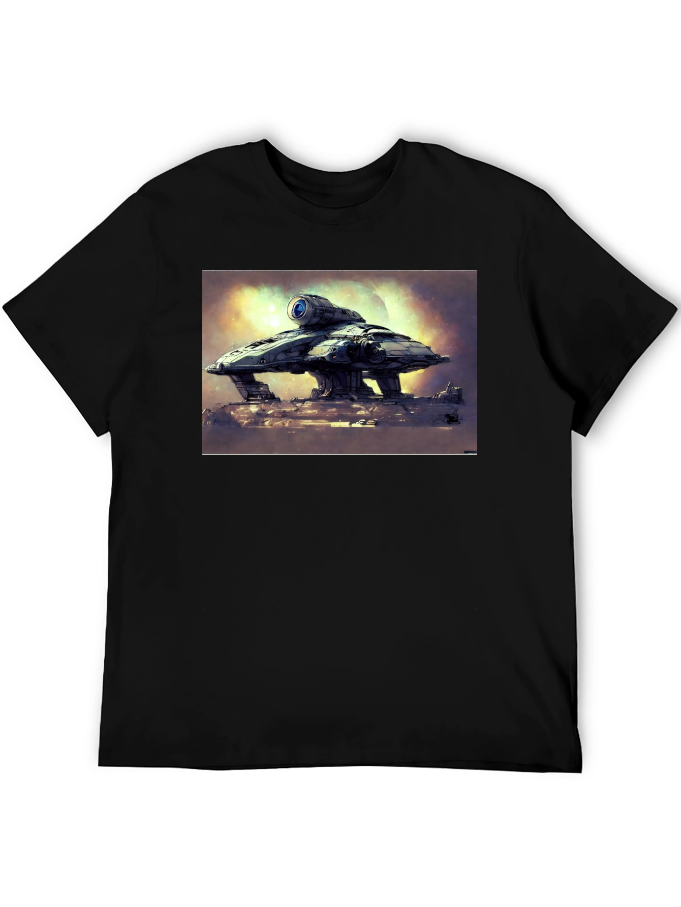 Elevate your style with this unique black t-shirt featuring a striking sci-fi spaceship graphic. The detailed illustration showcases a futuristic spacecraft against a cosmic backdrop, creating a captivating visual statement. Made from comfortable, breathable fabric, this t-shirt is perfect for everyday wear or for expressing your love for science fiction. The high-quality print ensures vibrant colors and long-lasting durability, even after multiple washes. Whether you're a fan of space exploration or simply appreciate artistic designs, this t-shirt is a must-have addition to your wardrobe. Pair it with jeans or shorts for a casual look that's sure to turn heads. A perfect blend of comfort and style!