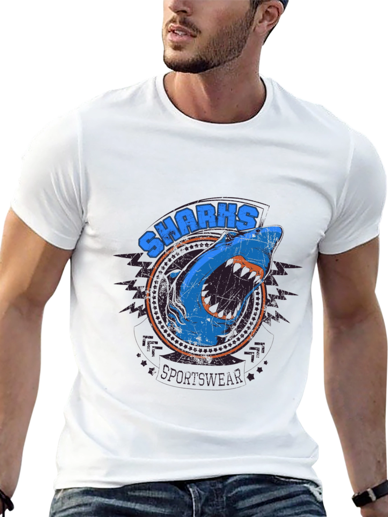 Show off your love for the ocean with this eye-catching graphic t-shirt. Featuring a bold shark design enclosed in a circular emblem, this shirt is both stylish and unique. The word "SHARKS" sits atop the graphic, while "SPORTSWEAR" is emblazoned below, indicating its athletic-inspired aesthetic. Perfect for casual wear, workouts, or a day at the beach, this t-shirt is made from a comfortable fabric that ensures breathability and ease of movement. Its black colorway makes it versatile for pairing with jeans, shorts, or athletic wear. Whether you're a shark enthusiast or just appreciate a cool graphic tee, this shirt is sure to make a statement.