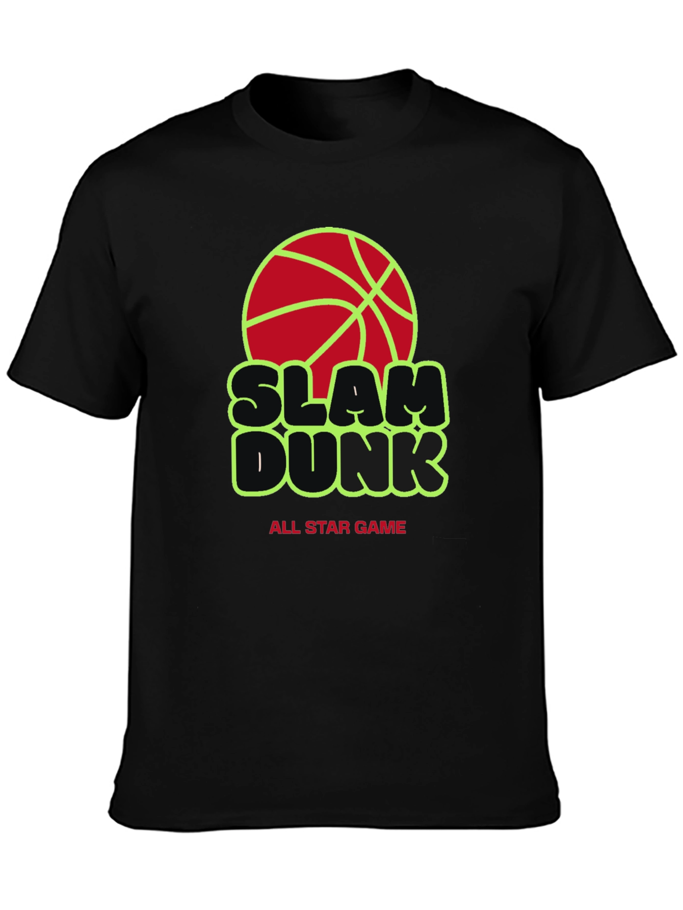 Score a style slam dunk with this bold black graphic tee! This eye-catching shirt features a vibrant design with a red basketball outlined in green, stacked above the words "SLAM DUNK" in a chunky, shadowed font, and "ALL STAR GAME" printed underneath. The design makes this t-shirt a standout piece. Made from a comfortable fabric, this tee is perfect for casual wear, sports events, or showing off your love for the game. Get ready to turn heads and show off your passion for basketball with this unique and stylish t-shirt.