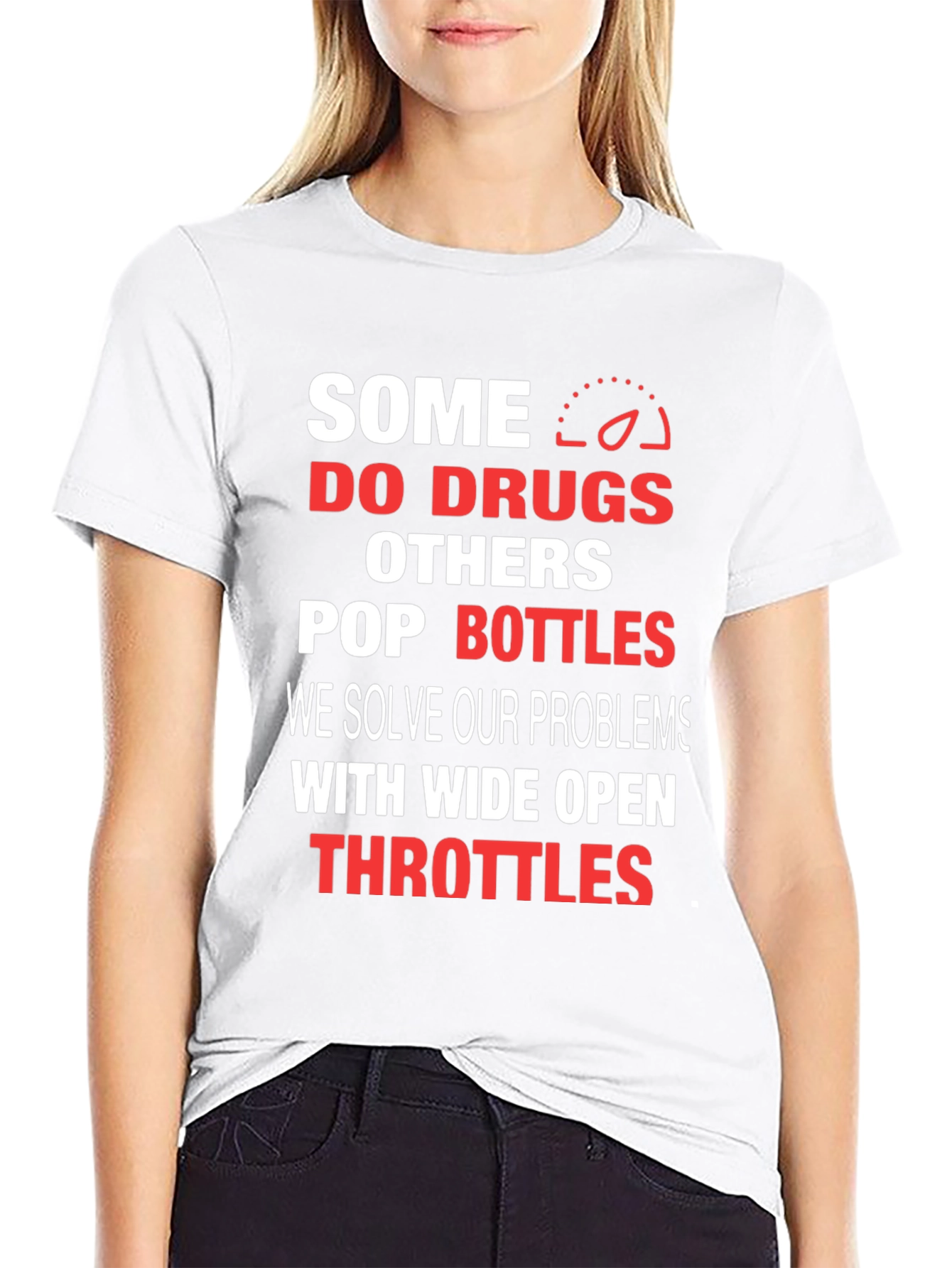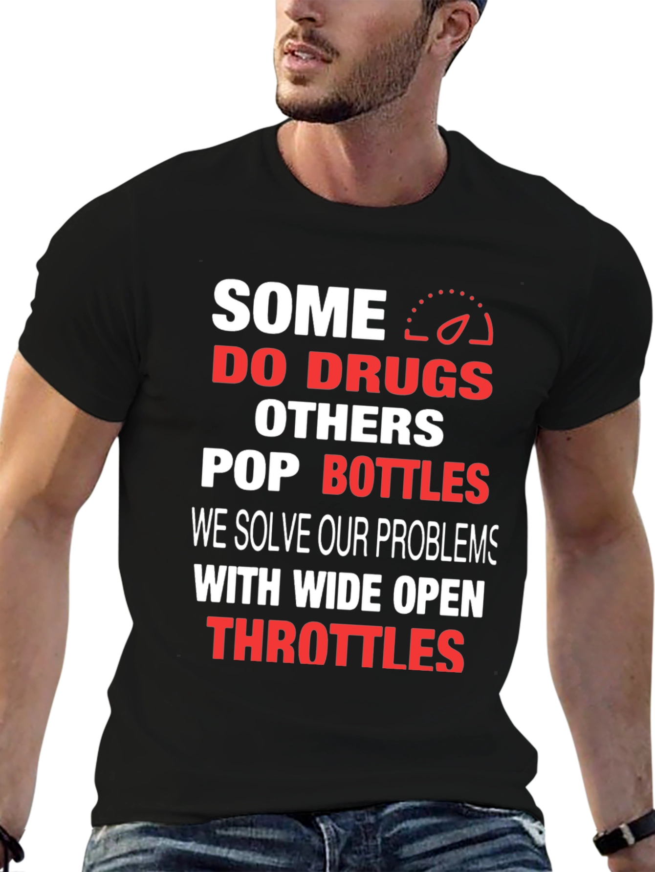 This eye-catching black t-shirt features a bold, humorous graphic print. The design includes the text "SOME DO DRUGS OTHERS POP BOTTLES WE SOLVE OUR PROBLEMS WITH WIDE OPEN THROTTLES," accented with a speedometer-style graphic. The words "DO DRUGS" and "THROTTLES" are colored in red, providing a striking contrast against the black background. Made from a soft-looking fabric, this shirt promises both style and comfort. Perfect for casual wear, car enthusiasts, or anyone with a playful sense of humor, this tee is sure to turn heads and spark conversations. Stand out with this uniquely designed shirt that celebrates a love for speed!