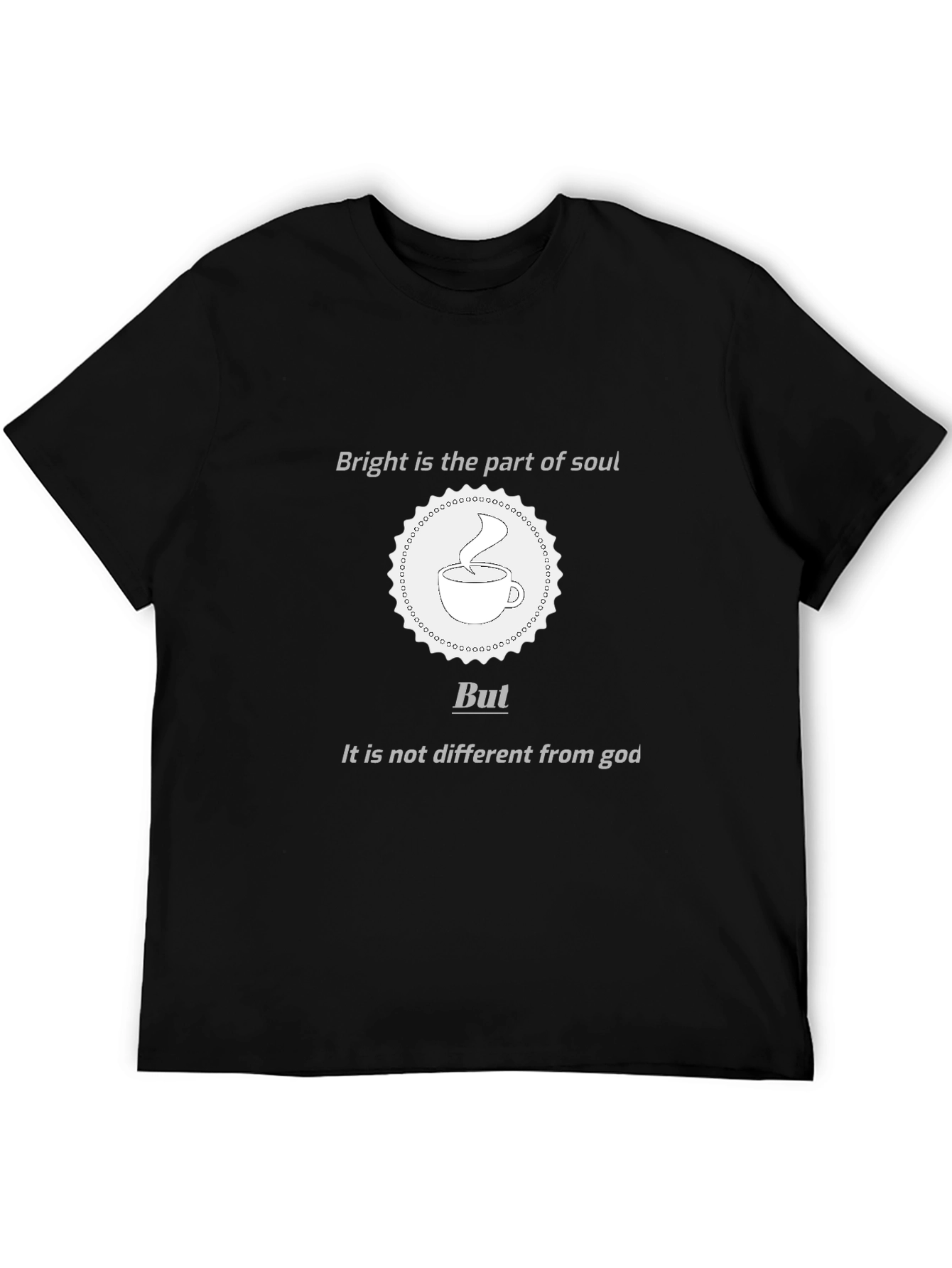 Elevate your style with this unique black tee! Featuring the phrase "Bright is the part of soul", centered above a charming coffee cup graphic. The design is completed with a quote that challenges thought: "But, It is not different from god". The soft fabric ensures comfortable wear, making it perfect for casual outings or introspective moments at home. It's a conversation starter, sure to add a touch of inspiration and individuality to your wardrobe. Embrace the blend of comfort, style, and a little philosophical flair with this standout piece.